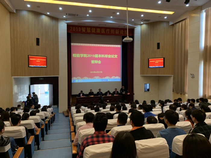 毕业生撰写并答辩毕业论文是人才培养的一个重要环节,也是检验学生综合素质、实践和创新能力的有效途径。答辩之前,检验学院实习生“双导师”指导并贯穿毕业课题与论文撰写全过程,严格过程管理和质量控制;学院专家委员会对论文选题严格把关,邀请校督导组组长张根葆教授及院外相关专家组织论文评阅;答辩专家中校外专家占2/3以上,有力地保证了论文的质量和答辩质量。