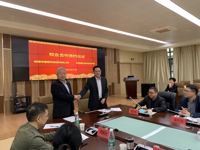 为进一步扩大校企合作范围,积极争取校外资源,加强检验人才培养,4月27日下午,安徽华康医药集团有限公司与检验学院签署校企合作协议,捐资扶困扶智。协议签署仪式在四号实验楼二楼学术报告厅举行,教务处副处长陈祥攀,参加检验学院毕业论文答辩的省内外21名专家,检验学院党总支书记、院长文育锋,党总支副书记、副院长崔晓霞,副院长浦春,以及学院全体教师参加会议。签约仪式由浦春主持。