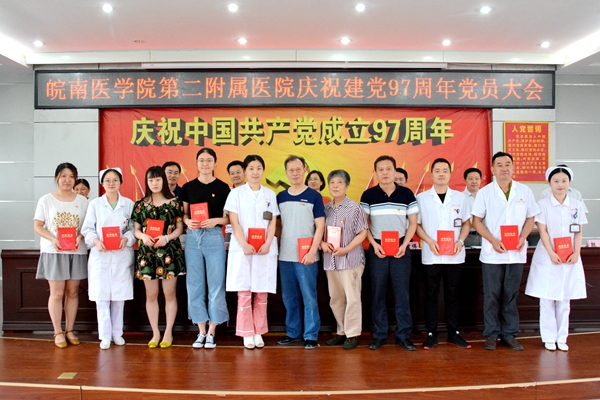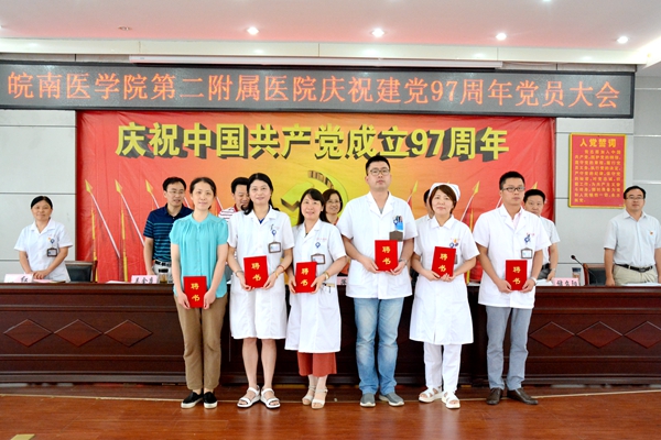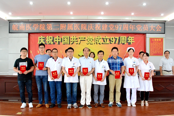 二附院党委书记李萍作讲话。她回顾了中国共产党97年来团结带领中国人民不懈奋斗的历程,简要总结了医院2018年上半年党建及各项主要工作,指出目前正是医院实现“十三五”规划发展目标关键时期,我们必须要增强紧迫感、使命感和责任感,创新思路,真抓实干,谱写医院持续健康发展新篇章。她强调了三点意见:一是必须坚持全面从严治党,建设风清气正的二附院;二是必须适应发展新常态,建设有实力有品牌的二附院;三是坚守使命担当,争当二附院建设发展的先锋。