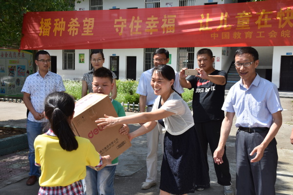 为关爱留守儿童,守望幸福未来,贯彻落实全总、省总及省教科文卫体女工委有关关爱留守儿童的要求,2018年6月21日,校工会主席汪全海、心理学教授刘新民、女工委副主任任苔蓉赴石台县九步村小学开展为农村留守儿童提供关爱服务活动。活动得到石台县教育工会和该村村委的大力支持。
