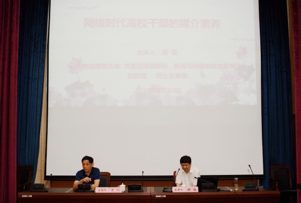 6月22日,我校邀请安徽师范大学党委宣传部部长、新闻与传播学院党委书记、副教授、硕士生导师胡靖作《网络时代高校干部的媒介素养》专题讲座。全校处级干部和机关科级干部聆听讲座。校党委副书记李刚主持讲座。