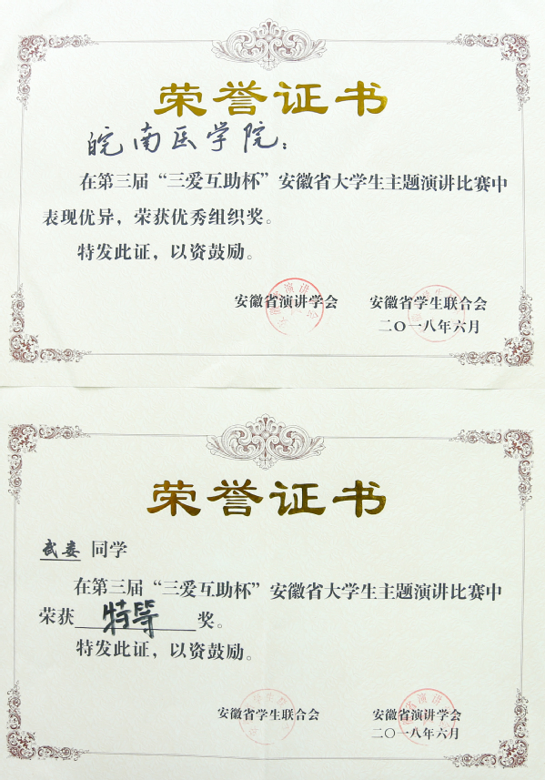 6月9日,由省学联、省演讲学会主办的第三届“三爱互助杯”全省大学生演讲比赛在安徽省社会科学院拉开帷幕。我校学子发挥稳定,表现出色,在来自25所参赛高校的51名参赛选手中以预赛、决赛得分双第一的好成绩脱颖而出,一举夺得本次比赛的特等奖,我校荣获优秀组织奖。