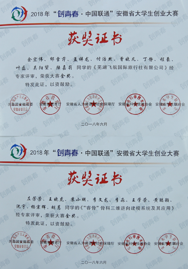 伴随着全省各个高校创新创业教育的稳步推进,“创青春”大赛的作品竞争日趋激烈。本次我校选拔出9件作品参加省赛,其中2件作品入围省赛现场决赛。经过激烈比拼,我校创业计划赛作品《“睿骨”骨科三维逆向建模系统及其应用》(药学院)和创业实践赛作品《芜湖飞航国际旅行社有限公司》(校团委)在竞赛中脱颖而出,拔得头筹,双双取得了金奖的好成绩。这也是我校首次在“创青春”创业计划赛和创业实践赛中获省级赛事金奖。皖医青年用实际行动为母校增光添彩,为校庆60周年献礼。