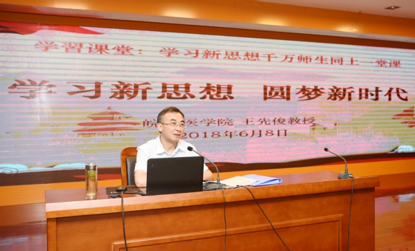 为深入学习宣传贯彻习近平总书记在北京大学师生座谈会和纪念马克思诞辰200周年大会上的重要讲话精神,落实教育部和安徽省“学习新思想千万师生同上一堂课”活动要求,6月8日上午,校党委书记、全国高校“学习新思想千万师生同上一堂课”安徽省讲师团成员王先俊教授在图书馆三楼报告厅为我校师生作题为“学习新思想 圆梦新时代”的讲座,全校各院部教师、辅导员和学生代表300余人聆听授课。