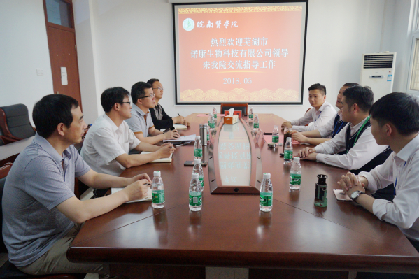 在与芜湖先声中人药业有限公司交流中,韩军就校企共建实验室项目的推进情况进行了介绍,双方就共建内容进行了深入探讨。在与芜湖市诺康生物科技有限公司交流中,双方与会人员就产学研、人才培养、科研平台共建等多方位合作的切入点进行了深入交流,并就一产品的研究达成横向课题共识,也为下一步合作的具体实施奠定了良好的基础。