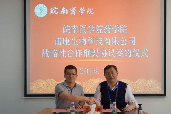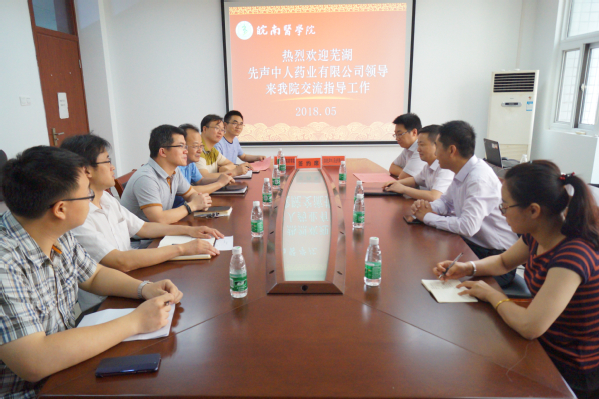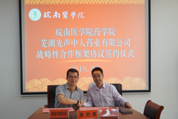 为进一步拓宽校企合作渠道,推进学院产学研建设,促进校企合作互助共赢,5月3日、16日,江苏先声药业集团下属分公司芜湖先声中人药业有限公司总经理徐刚、副总经理朱伟,芜湖市诺康生物科技有限公司董事长许震、销售总监钱志刚等,先后来我校开展座谈交流工作,并与药学院签订战略合作协议。药学院党委书记李康才、院长韩军、副院长年四辉,科研处副处长李祥子,药学院相关学科负责人等出席并参加签约仪式。