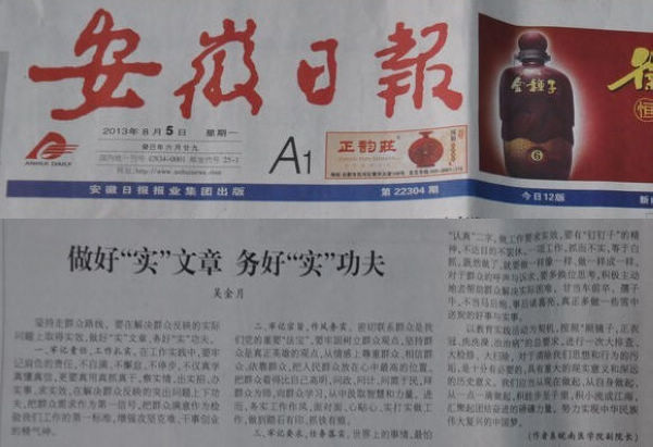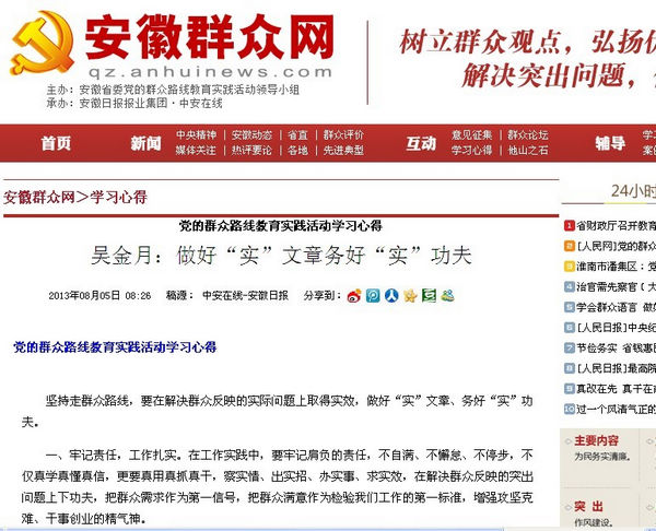 8月5日出版的《安徽日报》在其“党的群众路线教育实践活动学习心得”专版第一期中刊发了我校副院长吴金月教育实践活动学习心得《做好“实”文章,务好“实”功夫》,与此同时,《安徽群众网》也予以转载。