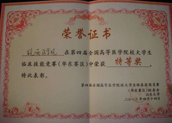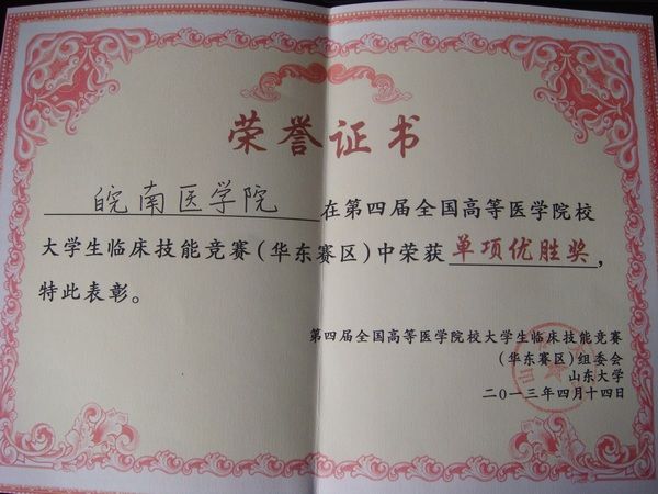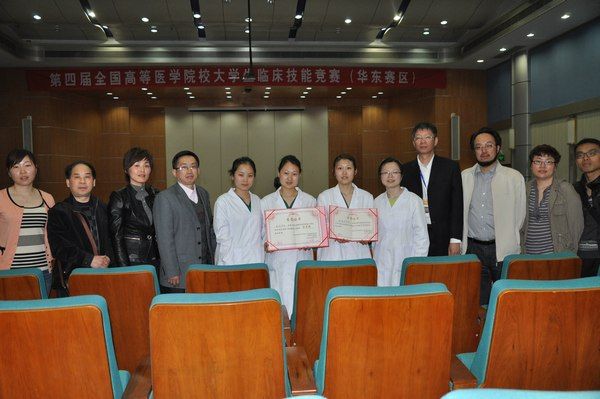 2013年4月13日至14日,由教育部主办的第四届全国高等医学院校大学生临床技能竞赛(华东赛区)在山东大学趵突泉校区举行。来自华东六省一市包括第二军医大学、南京医科大学、同济大学、山东大学等38所高等院校的38支代表队、152名临床医学专业学生选手齐聚山大,同场竞技。我校代表队在校党委委员、临床教学部主任、附属弋矶山医院副院长陈斌,教务处副处长刘文艳的带领下参加了比赛。