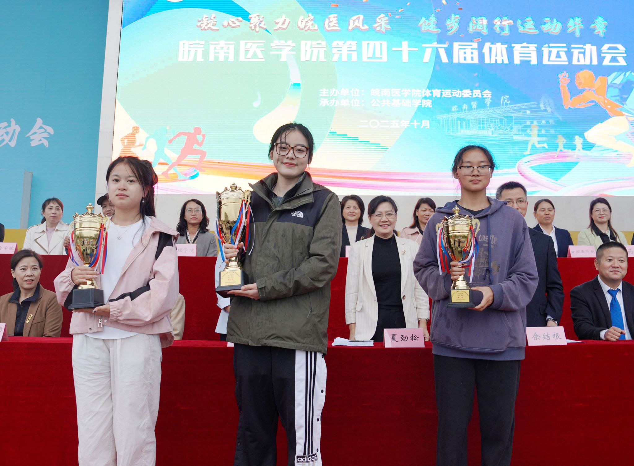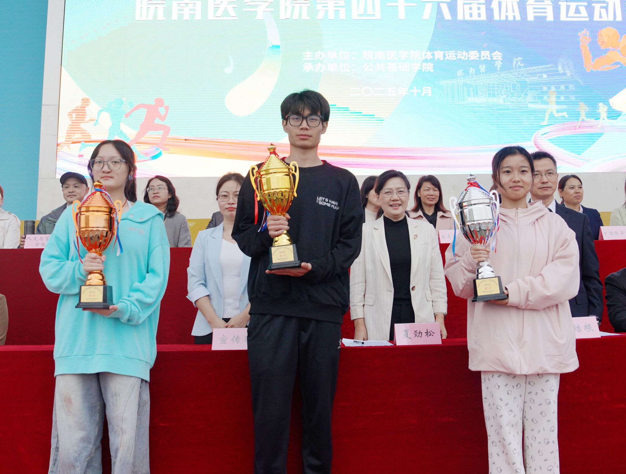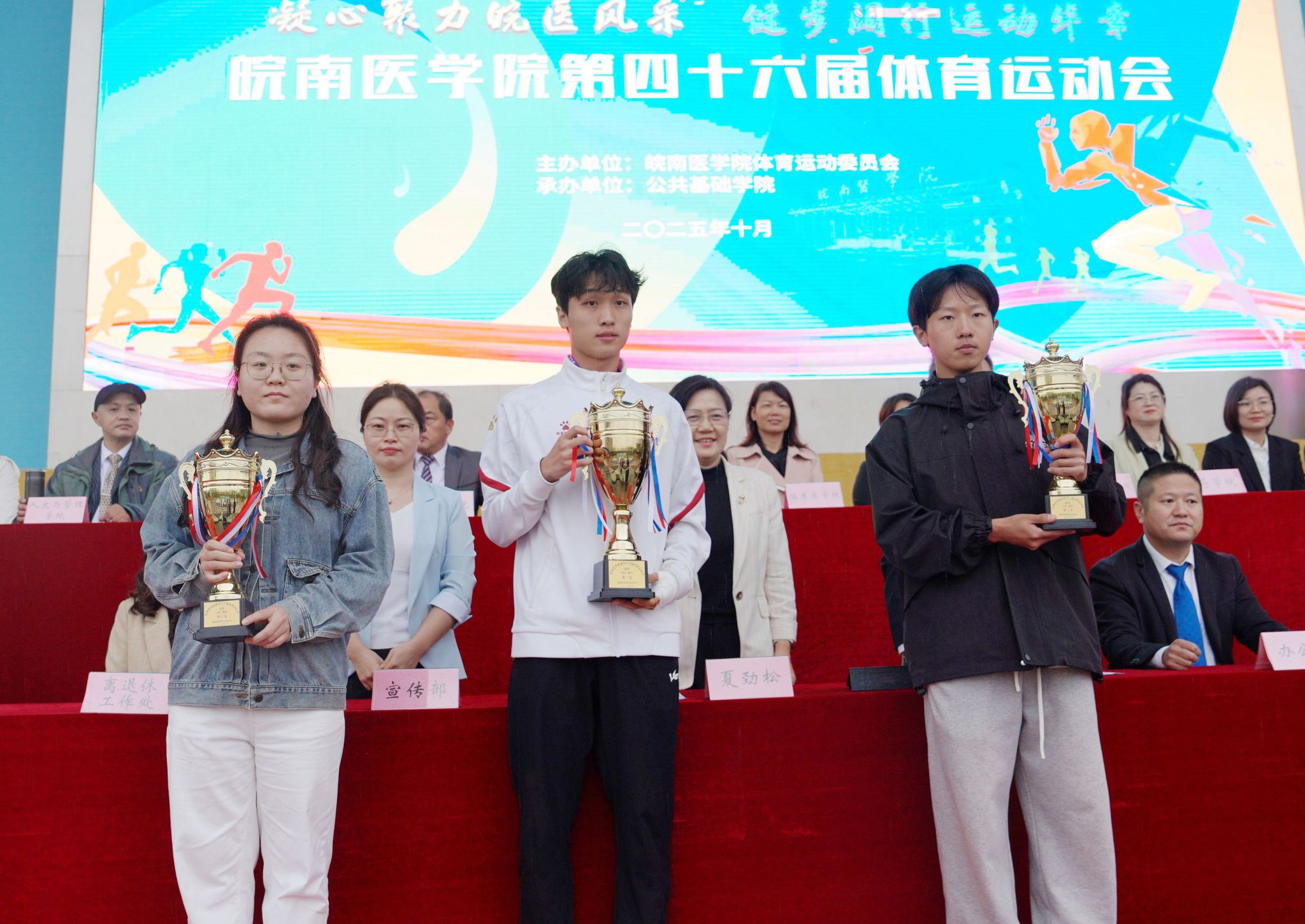 党委书记夏劲松发表热情洋溢的闭幕词。她首先代表学校向全体教练员、裁判员和工作人员表示衷心感谢,向取得优异成绩的集体和个人表示热烈祝贺,向所有在赛场上奋勇拼搏的运动员致以崇高敬意。夏劲松指出,运动赛场上处处涌动着活力与激情,展现着青春风采,彰显着皖医精神。她用四个"感动"深刻总结本届运动会的宝贵收获,一是运动员以无畏拼搏生动诠释了"突破自我"的深刻内涵,用汗水书写了青春最鲜活的模样;二是体育竞技唤醒了师生间最纯粹的情感共鸣,让团结互助的暖流在赛场涌动;三是同学们在竞技中体悟了直面挑战的人生智慧,学会以坚韧心态应对成长路上的风雨;四是赛场上的幕后工作者默默坚守,用热情和奉献保障赛事安全顺利进行。夏劲松希望同学们将运动场上的激情转化为勤奋学习的动力,让体育锻炼成为生活习惯,以强健的体魄和饱满的精神迎接未来的挑战,并将体育运动中培养的坚持、协作与拼搏精神融入日常学习和生活,使之成为成长道路上的宝贵财富。