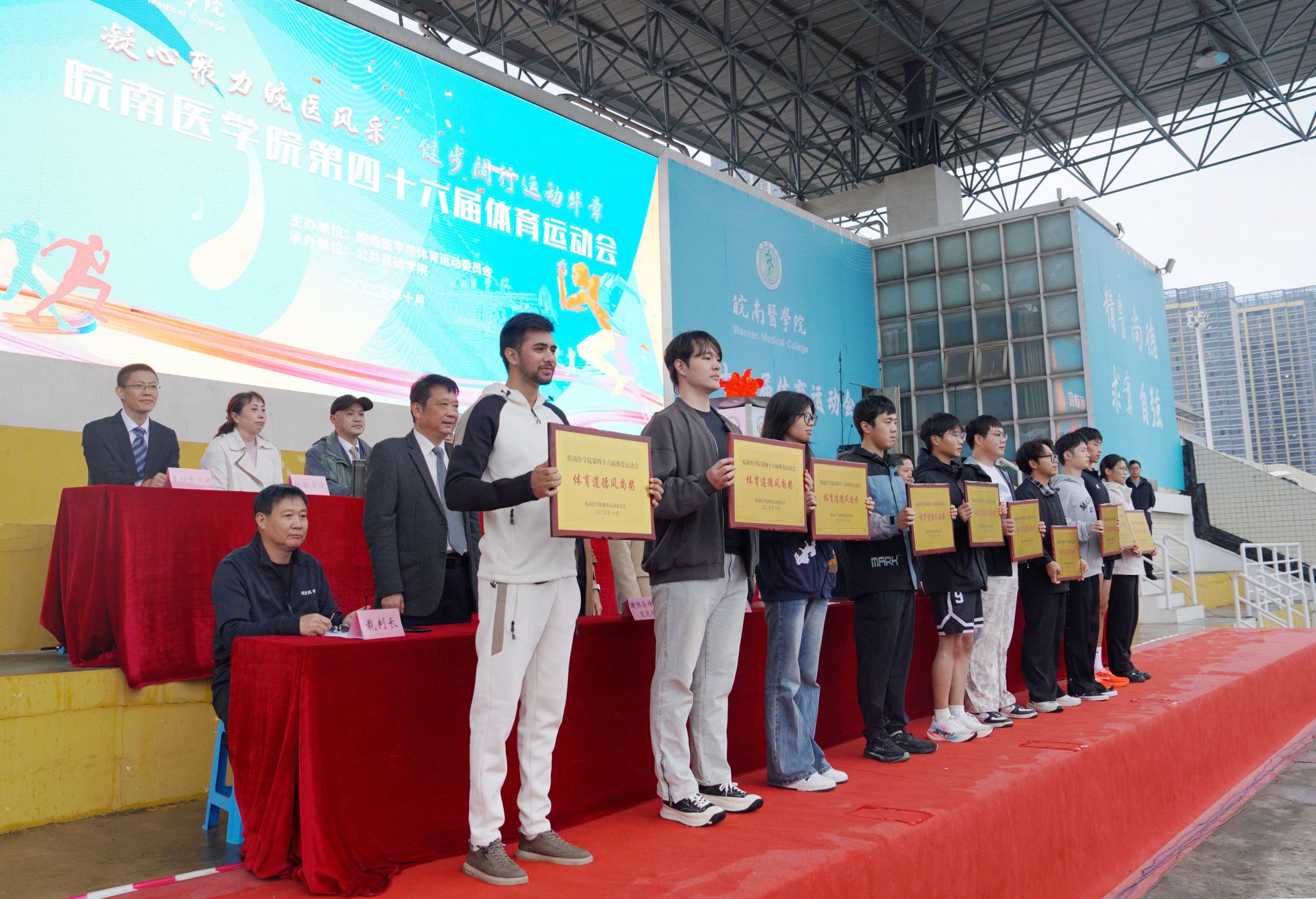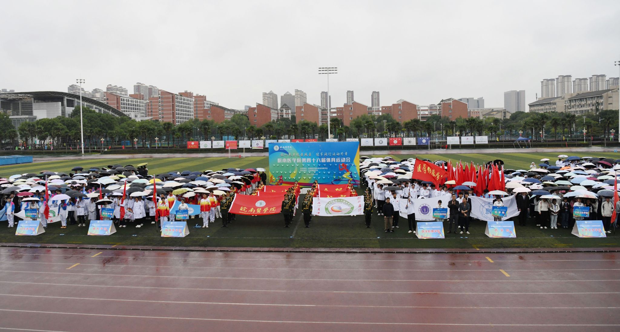 在全校师生医护员工的热情参与和共同努力下,我校第46届体育运动会圆满完成各项预定赛程,于10月18日下午胜利闭幕。闭幕式在田径运动场举行,在校校领导夏劲松、余结根,相关职能部门、各学院主要负责人在主席台就座。全体裁判员、教职医护员工代表和各学院学生代表参加闭幕式,党委常委、副院长余结根主持闭幕式。