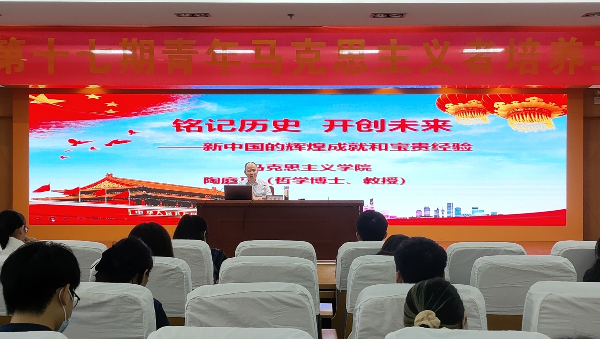 陶庭马以“铭记历史,开创未来——新中国的辉煌成就和宝贵经验”为题,详细介绍了新中国发展的历史起点、新中国创造的人间奇迹和开启中国奇迹的“金钥匙”,激励青马学员从新中国波澜壮阔的发展历程中汲取信仰力量,深刻体悟马克思主义的真理价值与中国共产党领导的显著优势,自觉将“爱国情、强国志、报国行”内化于心、外化于行,努力成长为可担大任的青年马克思主义者。