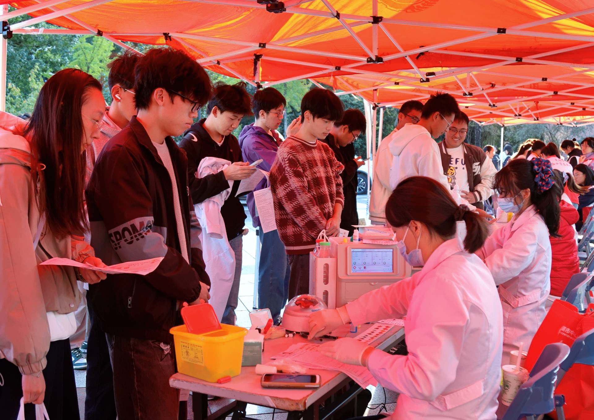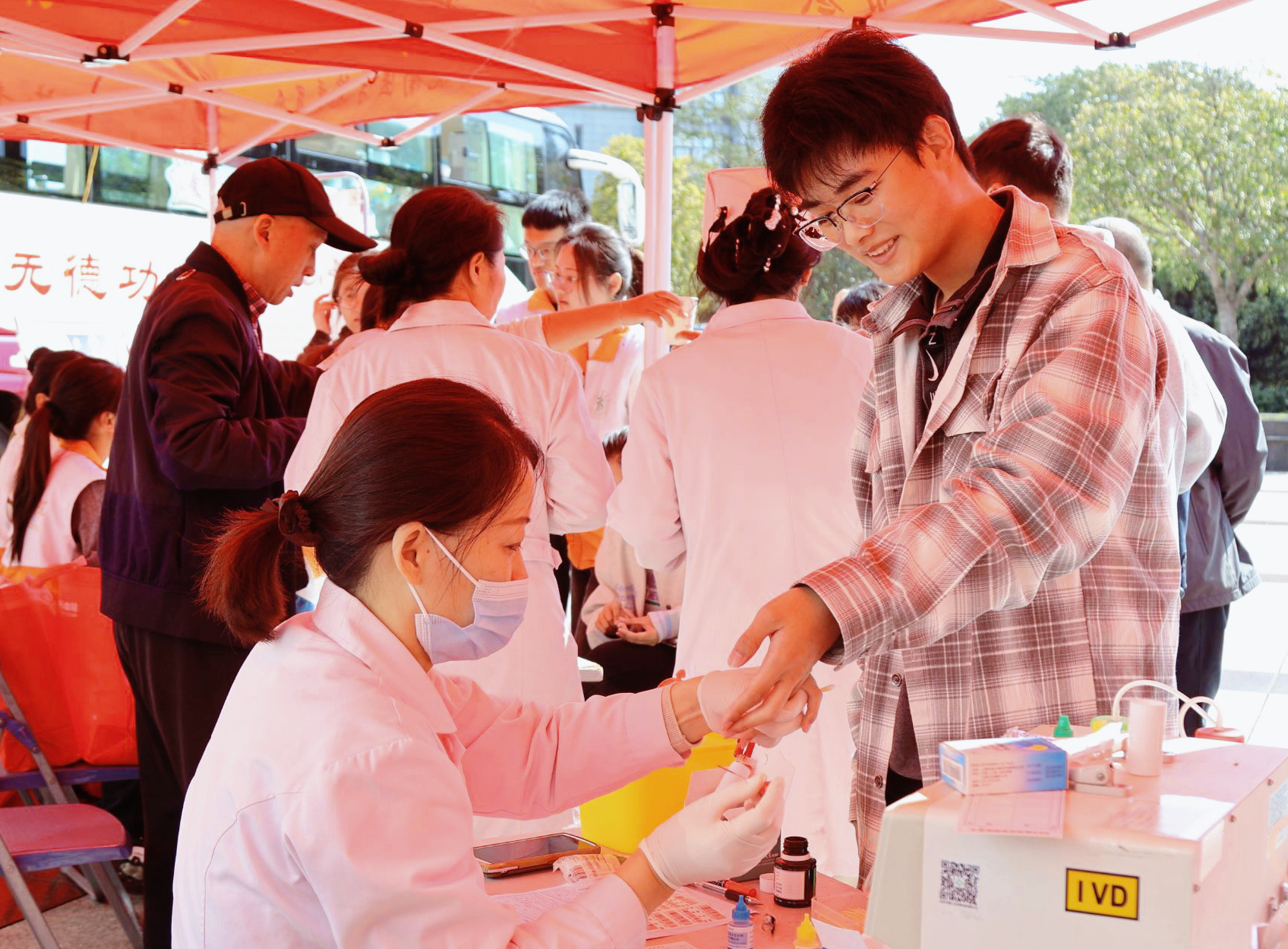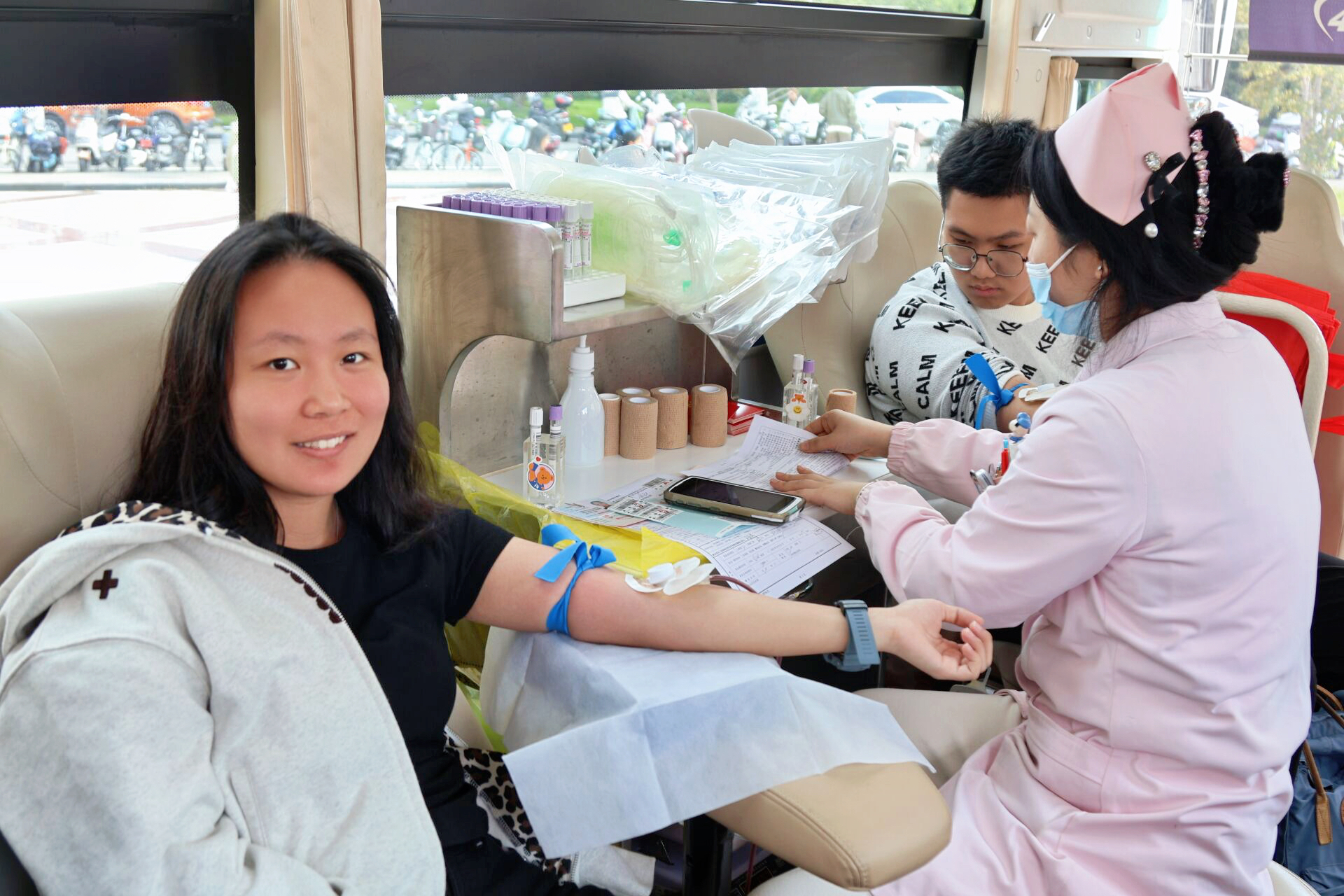 活动现场,温情涌动,秩序井然。在志愿者们与医护人员的密切配合下,师生们依次完成登记、体检、化验与采血等环节。登记台前、献血车上,一张张年轻的脸庞带着坚定与勇敢,记录下满是青春与热血碰撞的动人画面。医护人员专业严谨,每一针穿刺都精准细致;志愿者们贴心守护,一杯杯温热糖水、一句句暖心问候,让略显拥挤的献血车厢化作传递生命温度的爱心驿站。青年学子们从容挽袖,殷红的热血缓缓流入采血袋,犹如生命之河奔流不息,将医学生的课堂所学化为守护生命的实际行动,展现出从理论到实践、从学子到医者的成长与担当。