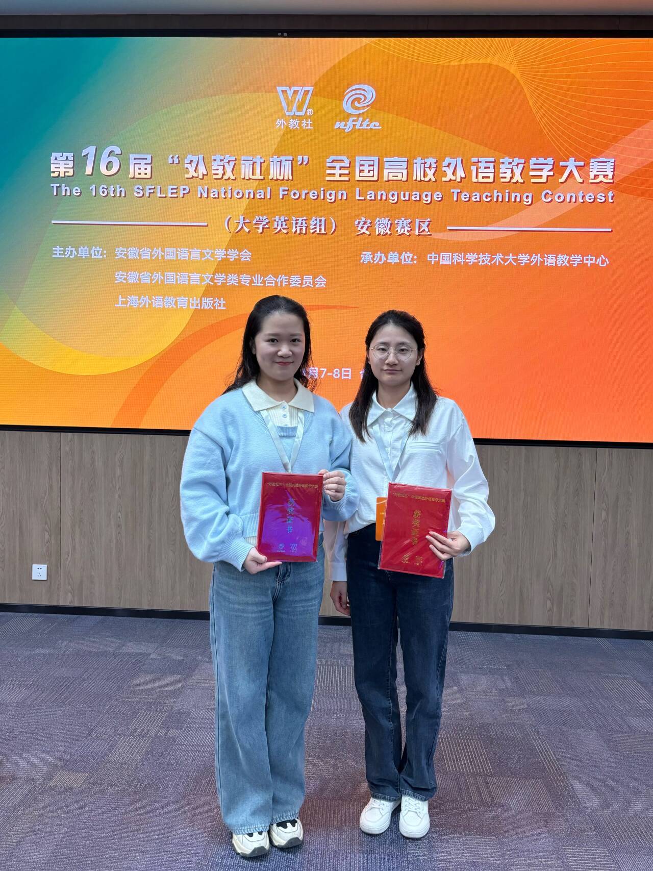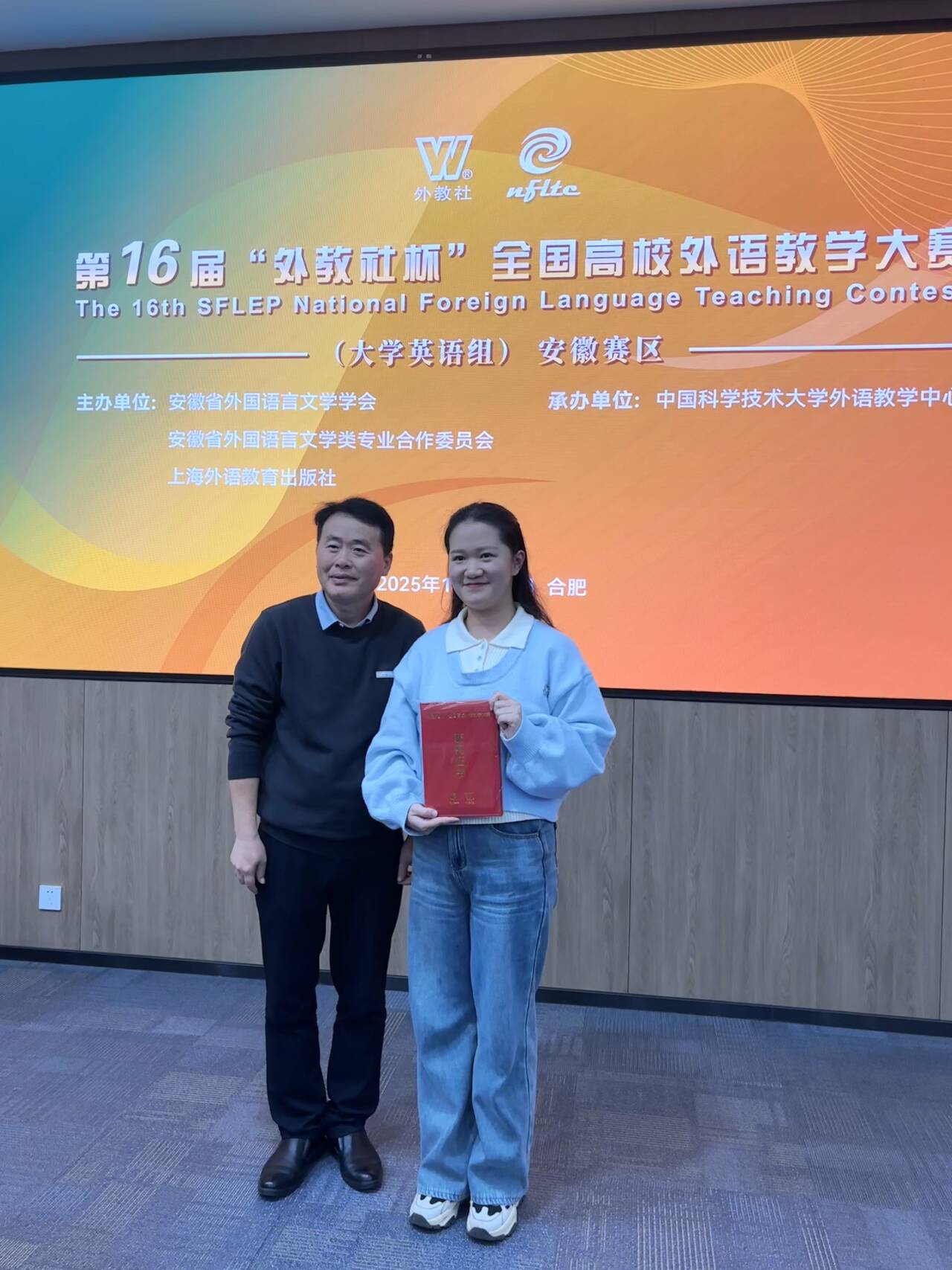 本届安徽赛区大赛由安徽省外国语言文学学会、安徽外国语言文学类专业合作委员会和上海外语教育出版社联合主办,中国科学技术大学外语教学中心承办,设有综合课组、视听说课组、传播中国组、研究生组四大组别,由14位外语权威专家评审团,从教学内容、教学方法、教学设计、即兴问答等多个维度对参赛教师进行综合评价。我校参赛教师以创新的教学设计、扎实的语言功底和深厚的教学素养,赢得了评委的高度认可。
