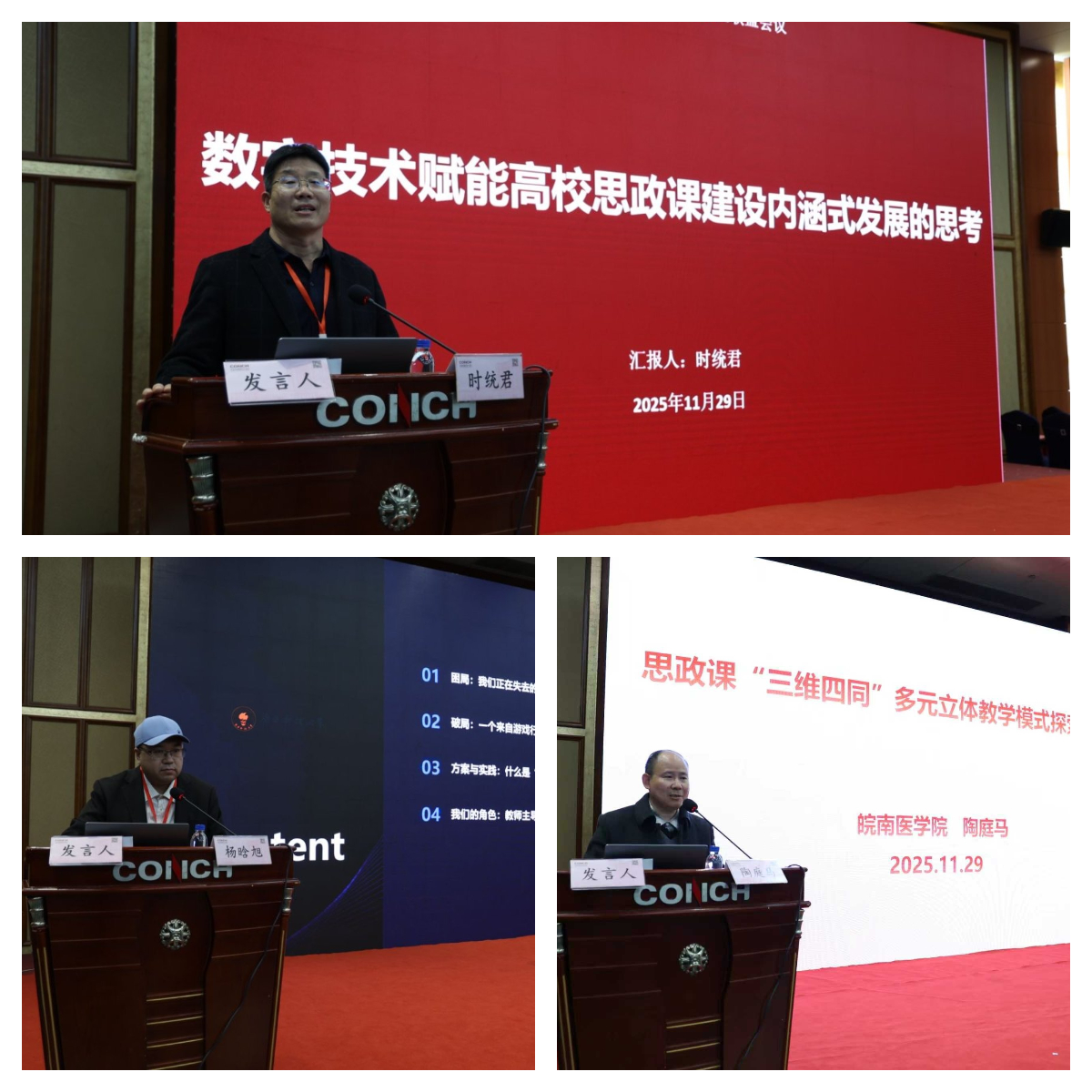 主题报告环节分两个阶段,汇聚了来自全国医学院校的11位专家分享前沿思考。第一阶段由内蒙古医科大学王彦教授主持,南京医科大学巩茹敏教授、哈尔滨医科大学李中华教授、温州医科大学崔华前教授、天津医科大学路向峰教授、山东第一医科大学陈士福教授等五位专家,分别聚焦“党的创新理论融入思政课”“重构思政课教育场域”“优化思政教育路径”等维度展开学理阐释。第二阶段由云南大学袁群教授主持,安徽中医药大学董玉节教授、重庆医科大学冯磊教授、山西医科大学苏果云教授、徐州医科大学时统君教授、南方科技大学杨晗旭副教授、皖南医学院陶庭马教授六位专家深入探讨了“大思政课”机制构建与人工智能赋能教学创新等实践议题。两阶段主题报告既有理论高度,又具实践深度,为新时代医学院校思政课守正创新提供了扎实的学理支撑与多样化的路径参考。