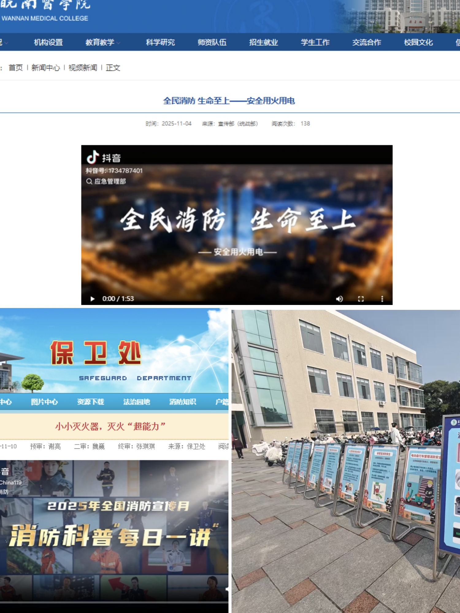 开展“全方位、多维度”宣传教育。消防宣传月期间,学校通过“线上、线下”立体化宣传矩阵,让消防安全知识触手可及。利用校园官网、消防安全管理微信群等形式,发布“全民消防、生命至上—安全用火用电”主题宣传片、“消防科普每日一讲”系列短视频,内容涵盖宿舍安全用电、实验室火灾预防、应急逃生技巧等专题;组织全体师生员工观看火灾事故警示教育片,让师生在触目惊心的画面中强化安全意识。线下,设置宣传展板,营造“人人学消防、人人懂消防”的浓厚校园安全氛围,切实提升师生消防安全意识和应急避险能力。