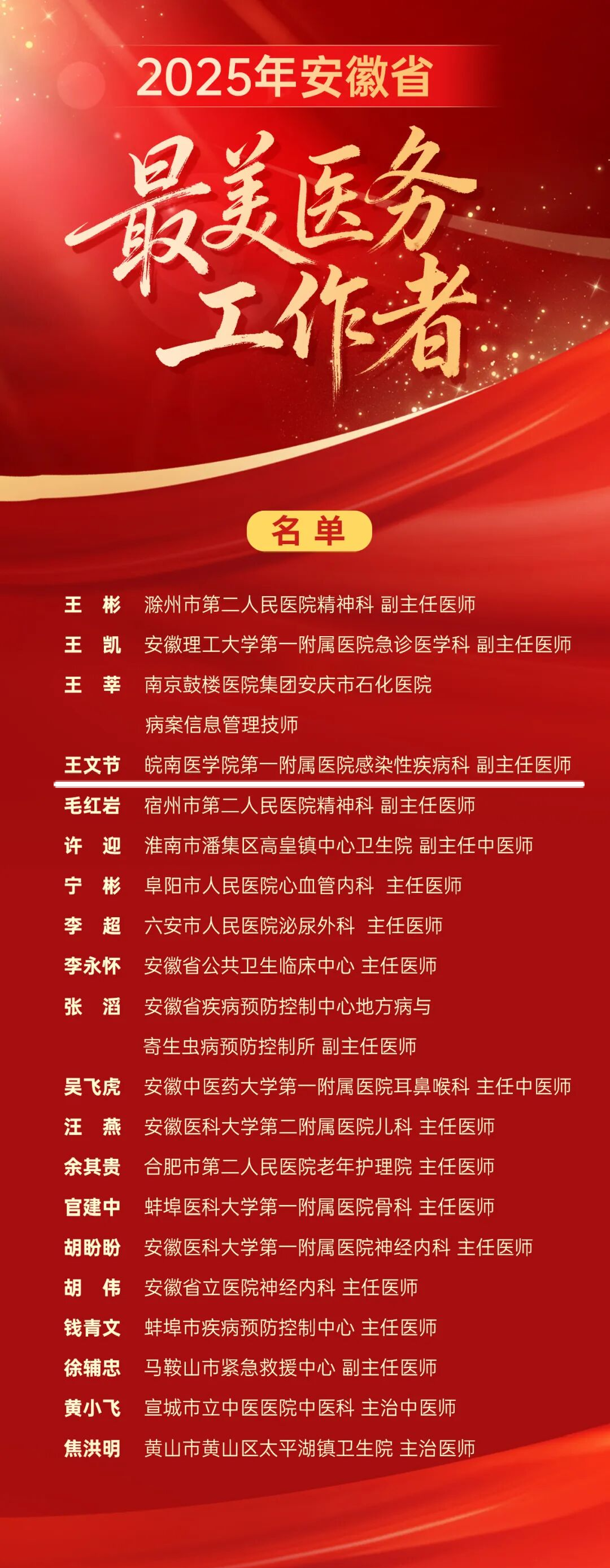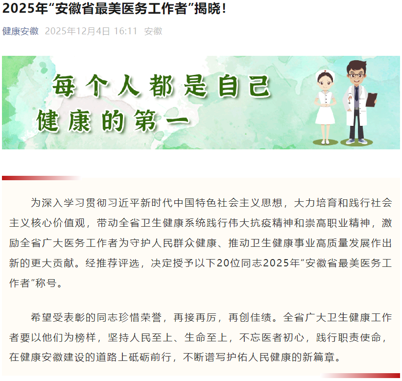 为深入学习贯彻习近平新时代中国特色社会主义思想,大力培育和践行社会主义核心价值观,带动全省卫生健康系统践行伟大抗疫精神和崇高职业精神,激励全省广大医务工作者为守护人民群众健康、推动卫生健康事业高质量发展作出新的更大贡献,安徽省卫生健康委、中共安徽省委宣传部开展2025年“安徽省最美医务工作者”评选活动。经推荐评选,第一附属医院感染性疾病科副主任医师王文节荣获2025年“安徽省最美医务工作者”称号。