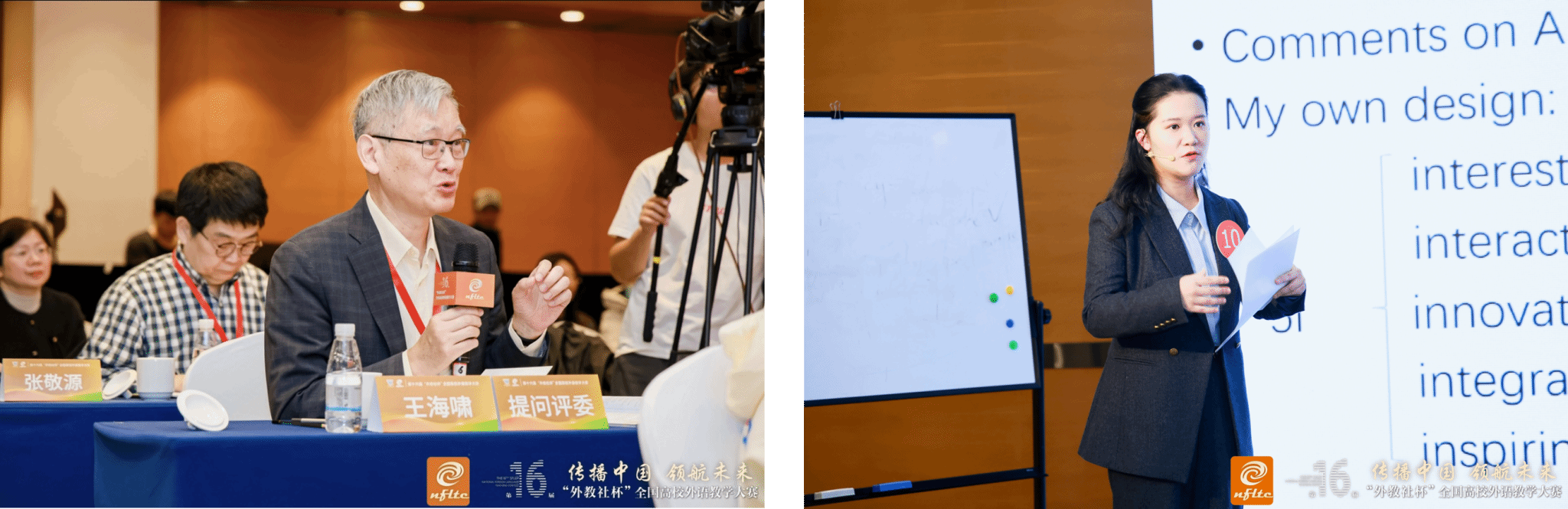 本届教学大赛分为综合课组和视听说课组,采用“线下授课+说课”相结合的形式,全国三十个赛区脱颖而出的省赛冠军教师同台竞技,比拼教学育人素养,集中展现高校外语教学的前沿实践。决赛环节要求选手依托自备备课资料现场授课并回应评委提问,重点考察课堂设计的实操性与教学功底;总决赛则创新性引入“AI 撰写教案”素材,要求入围选手在30分钟内完成视频内容解读、AI教案评价与个性化教学设计,随后进行10分钟说课及5分钟评委互动问答,凸显了“技术融合、思辨创新、立德树人”的高校外语教学发展导向。