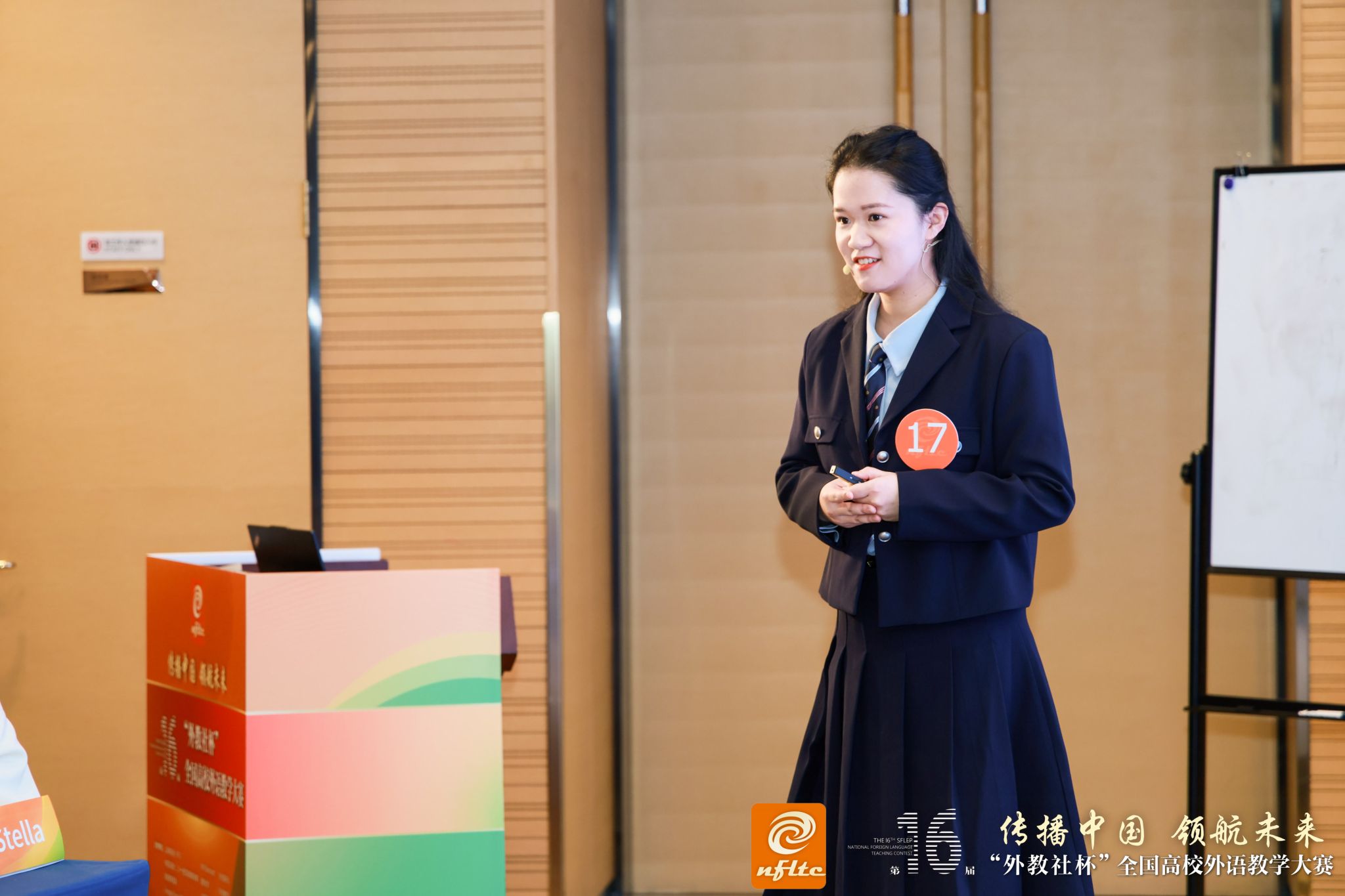 高洁老师在决赛现场凭借贴合时代需求的精妙教学设计、扎实的跨文化语言素养与亲和高效的授课风格,全力把握与全国985、211、“双一流”院校外语教师交流学习的机会,成功晋级总决赛前十强。最终,她以过硬的英语基本功、“语言能力与人文素养并重” 的教学理念、严密的思辨表达征服现场评委,圆满完成赛事挑战,其表现既体现了当代高校外语教学的核心要求,也为我校青年教师的专业成长提供了鲜活范本。