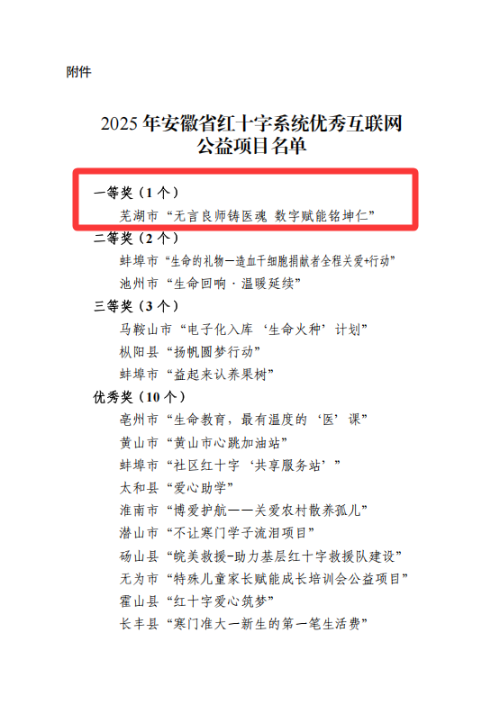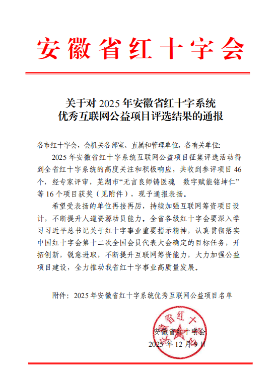 近日,安徽省红十字会公布2025年互联网公益项目评选结果,我校基础医学院遗体捐献接受站“无言良师铸医魂·数字赋能铭坤仁”项目荣获一等奖。此次获奖作为“传‘人间大爱’之美·感‘无言良师’之恩”——2024年安徽省网络公益行动优秀网络公益项目的延续,是对我校在遗体捐献公益领域辛勤付出的认可,更是对我校长期以来推进生命教育与实践育人成效的充分肯定,充分彰显了我校在引导学生敬畏生命、奉献社会方面的育人价值,生动诠释了立德树人与人文关怀的深度融合。