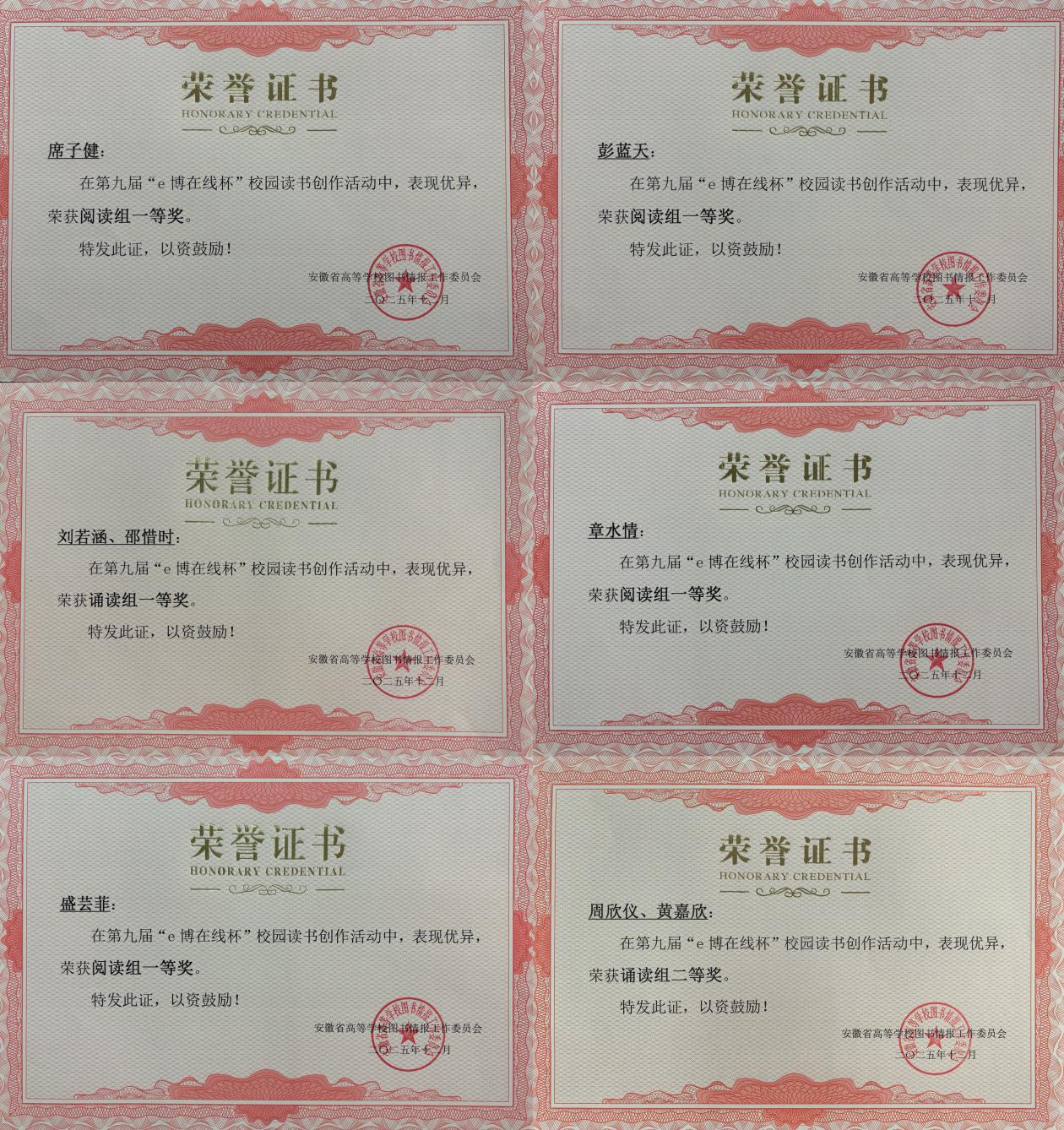 近日,由安徽省高等学校图书情报工作委员会主办的第九届“e博在线杯”校园读书创作活动获奖名单揭晓。我校学子在活动中表现优异,共获得一等奖5项、二等奖5项、三等奖5项,一等奖及获奖总数均位居省高校榜首,刷新了自参加该赛事以来的最好成绩。