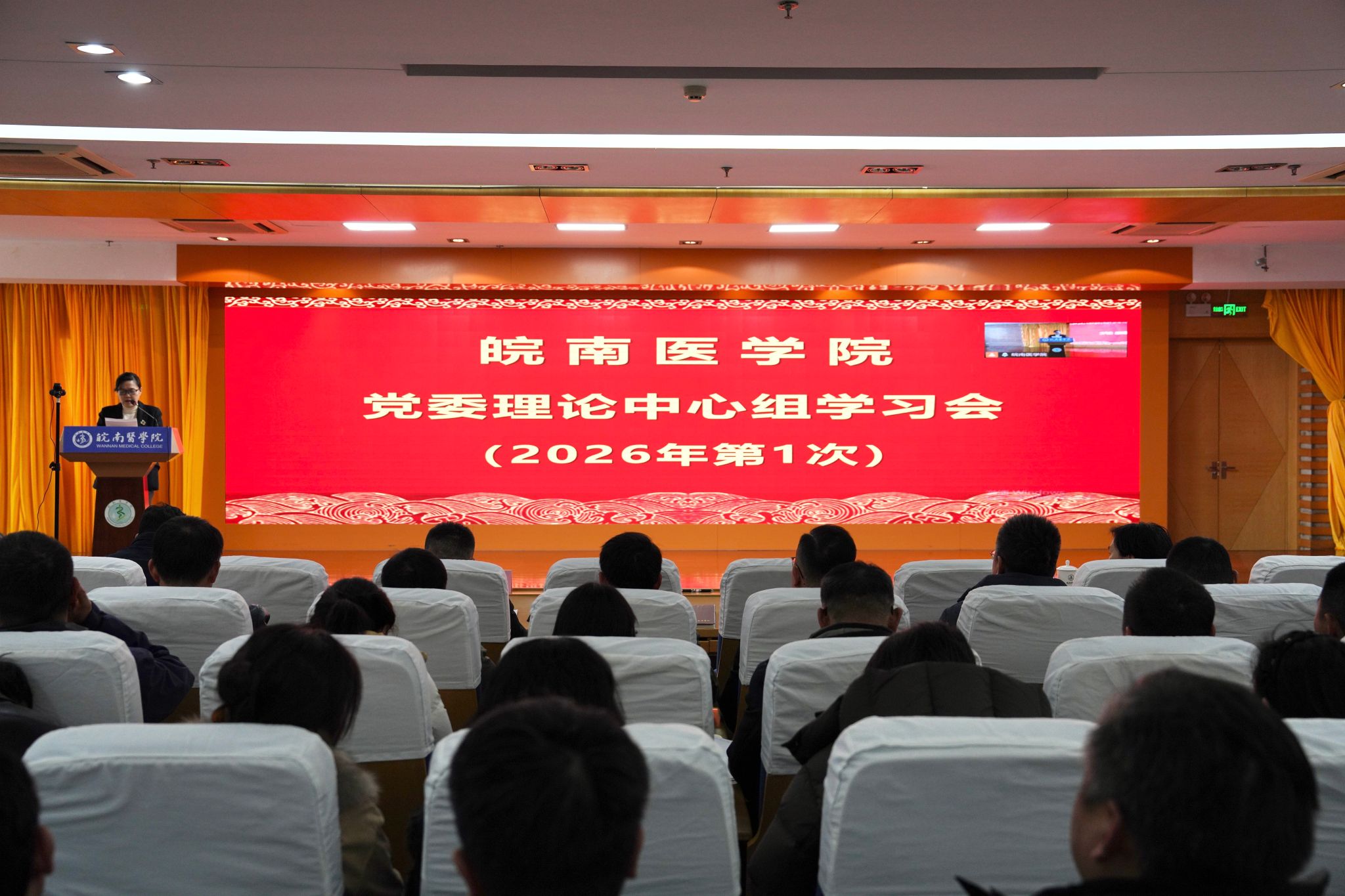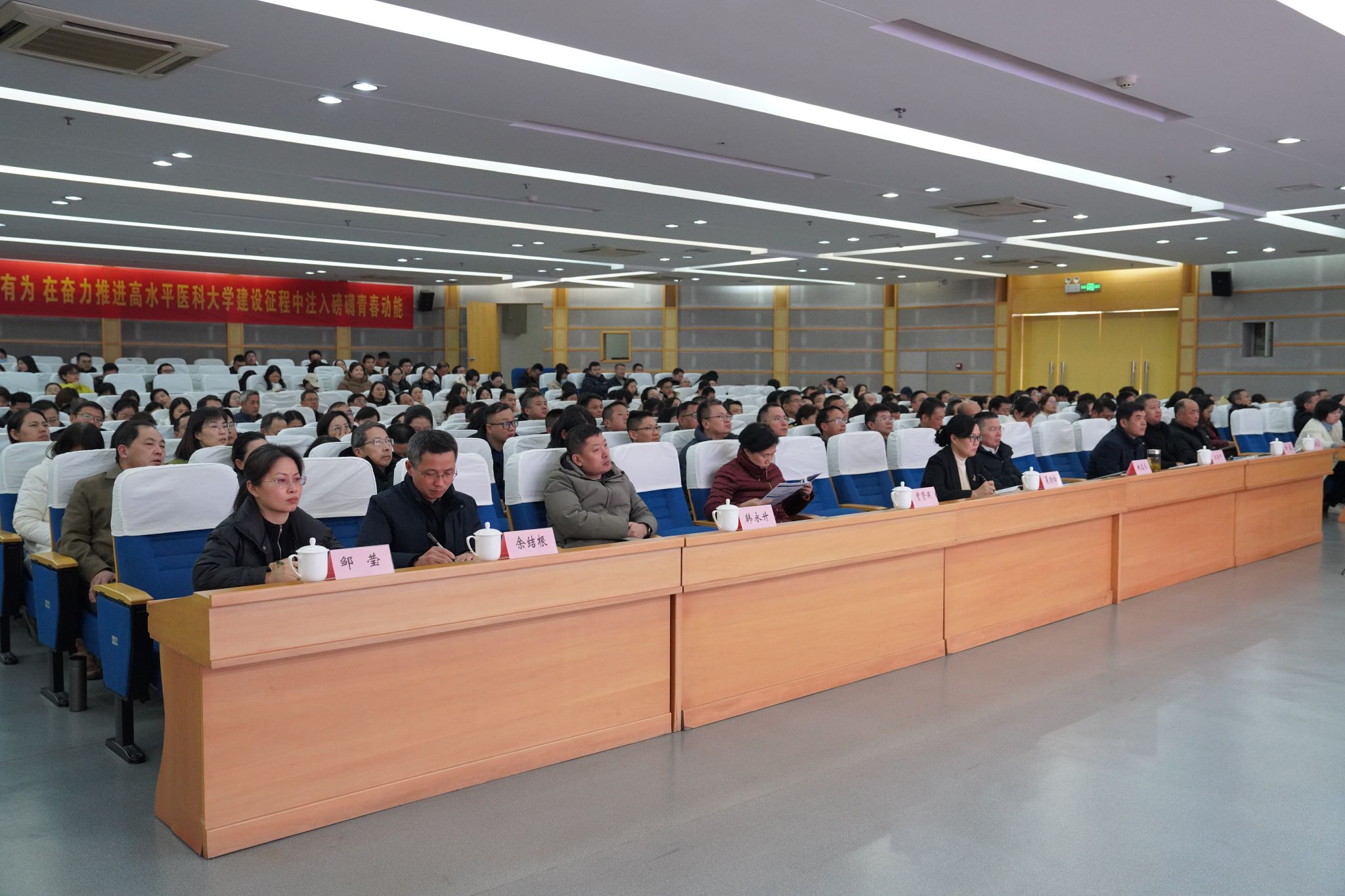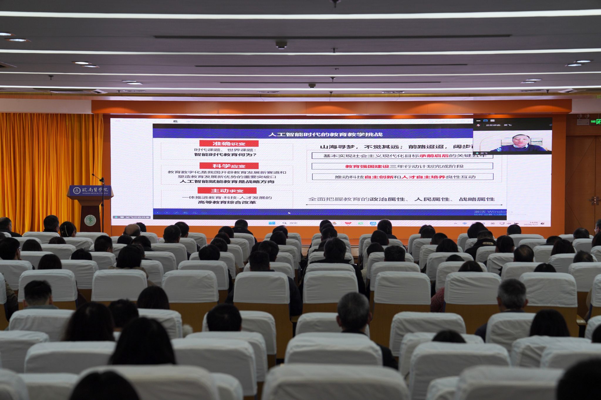 校理论学习中心组学习秘书、全体处级干部、机关党委全体人员、校本部党支部书记、各学院教学秘书与教研室主任、医学信息学院全体教师聆听报告。(郭佳薇/文、摄)