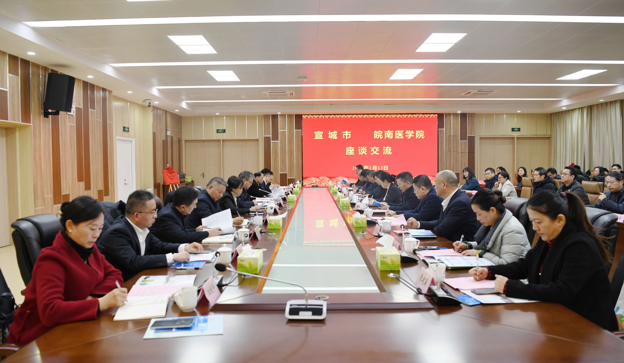 1月13日下午,皖南医学院与宣城市人民政府在滨江校区举行校地合作交流座谈会。宣城市委书记何淳宽,市委常委、组织部部长杨文武,市政府副市长杨林秀,宣城职业技术学院党委书记李斌,我校党委书记夏劲松,党委副书记、院长姚应水,党委副书记贾贤燕,党委常委、副院长韩永升、余结根出席会议。座谈会由夏劲松主持。