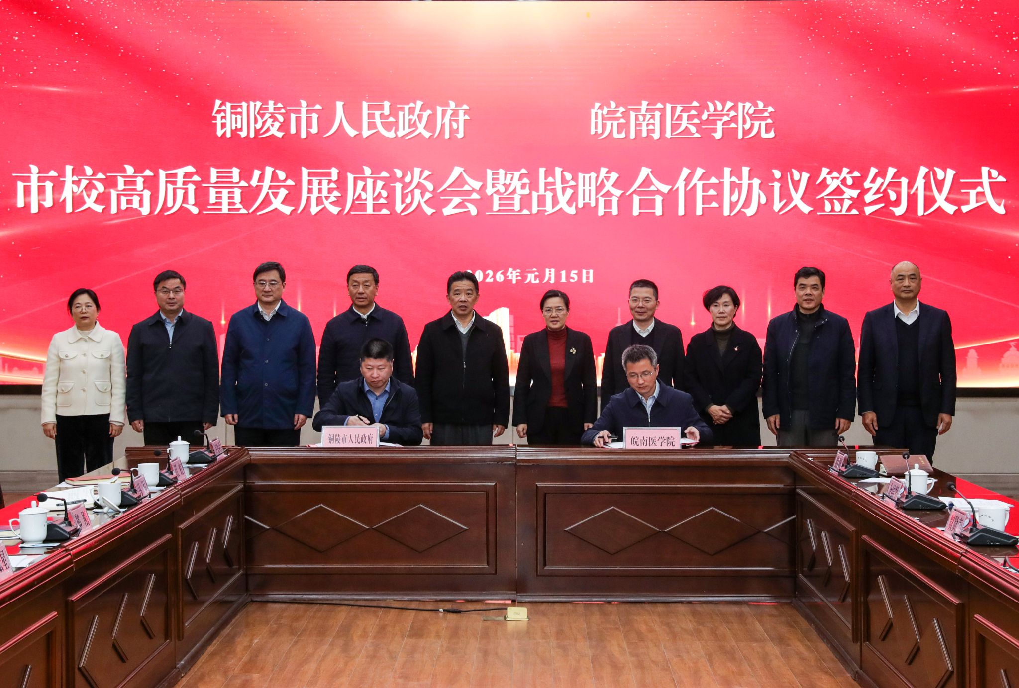 1月15日上午,皖南医学院与铜陵市人民政府市校高质量发展座谈会暨战略合作协议签约仪式在铜陵市举行。铜陵市委书记杨宏星,市委常委、组织部部长郑刚,市委常委、市政府常务副市长胡启书,市委常委、秘书长马军,铜陵职业技术学院党委书记凌勇,我校党委书记夏劲松,党委副书记、院长姚应水,党委副书记贾贤燕,党委常委、纪委书记、监察专员王保中,党委常委、副院长余结根出席仪式。仪式由杨宏星主持。