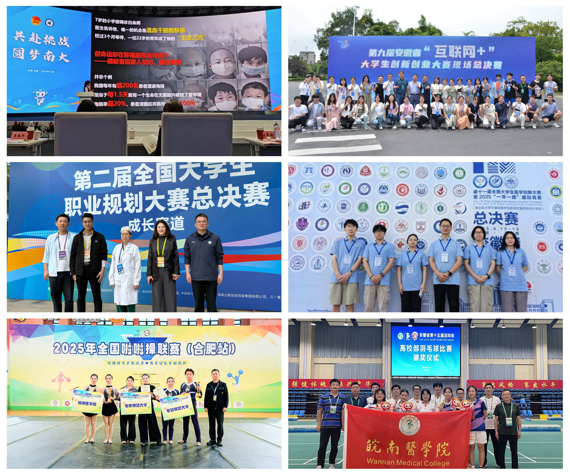 学生竞赛与综合素质全面出彩。获国家级大学生专业技能大赛团体一等奖8项。获中国国际大学生创新大赛、“挑战杯”、大学生职业规划大赛等A类赛事国家级奖项17项,其中“挑战杯”一等奖1项,刷新学校在A类赛事中的历史最佳成绩。在跆拳道、武术、田径等各类体育赛事中获国家级奖项18项、省级奖项84项;截至2023年,连续十二届获芜湖市专利大赛最高奖项。6名在校生捐献造血干细胞,书写医者担当;2名研究生荣登《人民日报》研究生国家奖学金获奖学生代表名录。获批国家级大学生创新创业训练计划项目367项。学生以第一作者发表论文174篇,获得专利/著作权179项(其中第一发明人105项),3名本科生分别直博清华大学、香港中文大学、澳门大学,绽放青春风采。
