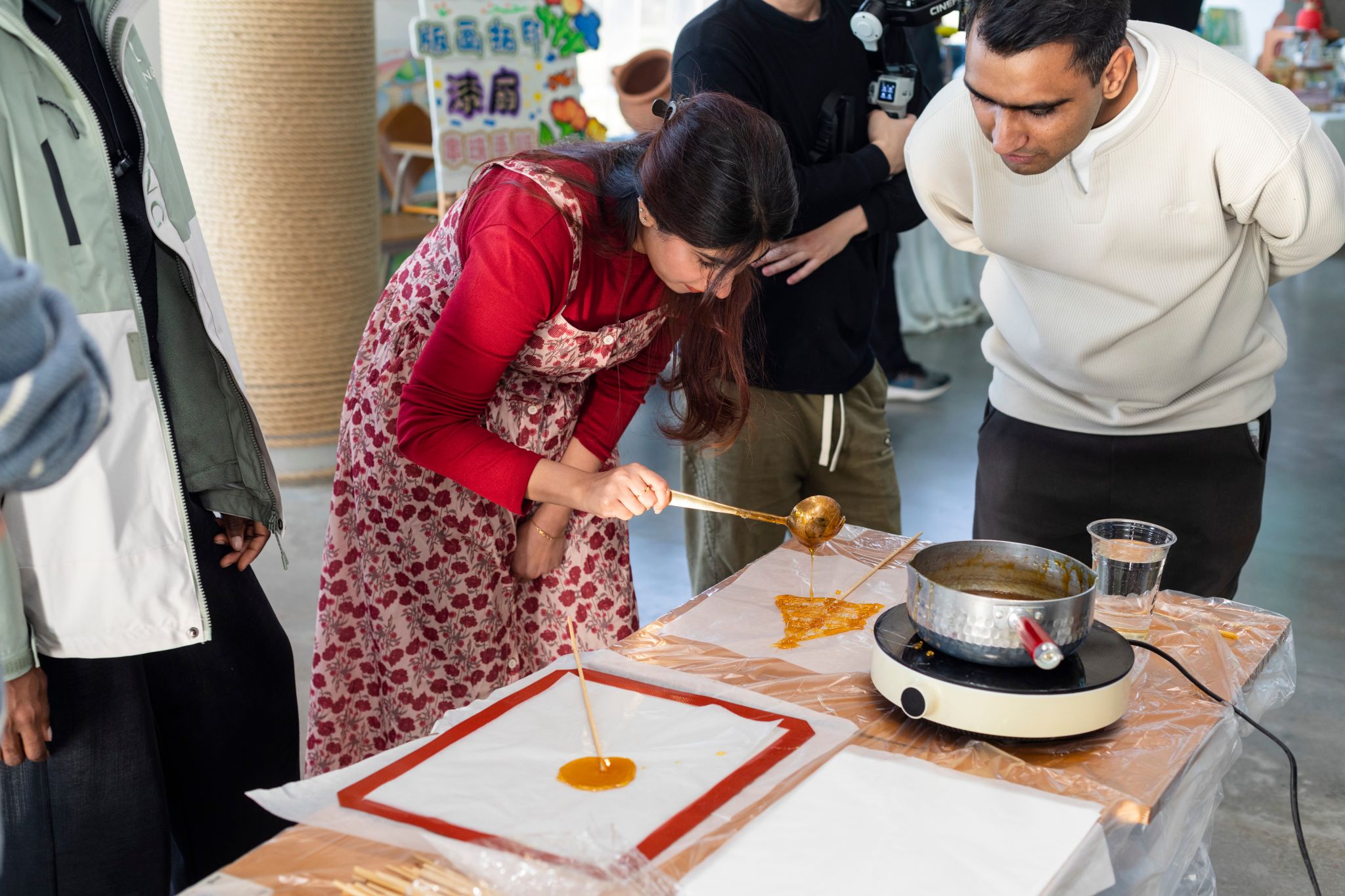糖画摊位前更是排起了长龙。糖画师傅手持铜勺,以糖稀为墨、石板为纸,手腕翻飞间,一个个栩栩如生的生肖、花鸟便跃然纸上。国际学生们亲手制作糖画,不仅让他们品尝到了春节的甜蜜味道,更被中国民间艺人的精湛技艺所折服。