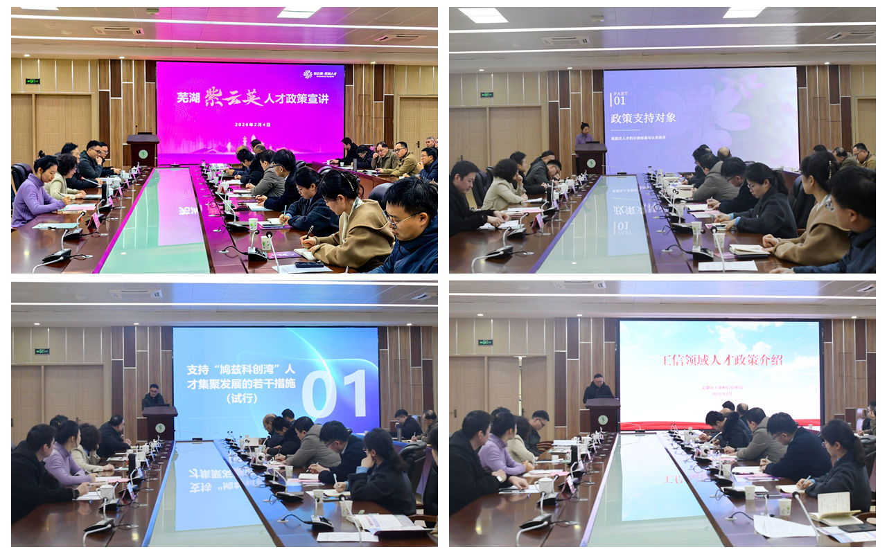 为深入贯彻落实中央及省委、市委关于人才工作的决策部署,深化校地合作,助力学校全面把握芜湖市最新人才、科技、产业政策,2月4日上午,芜湖市委人才局联合市人社局、市科技局、市工信局一行深入我校,在四号实验楼二楼会议室举办专场政策宣讲会。芜湖市委组织部副部长、人才工作局局长梁燕带队,相关部门科室负责人组团宣讲,会议由党委常委、副院长韩永升主持。