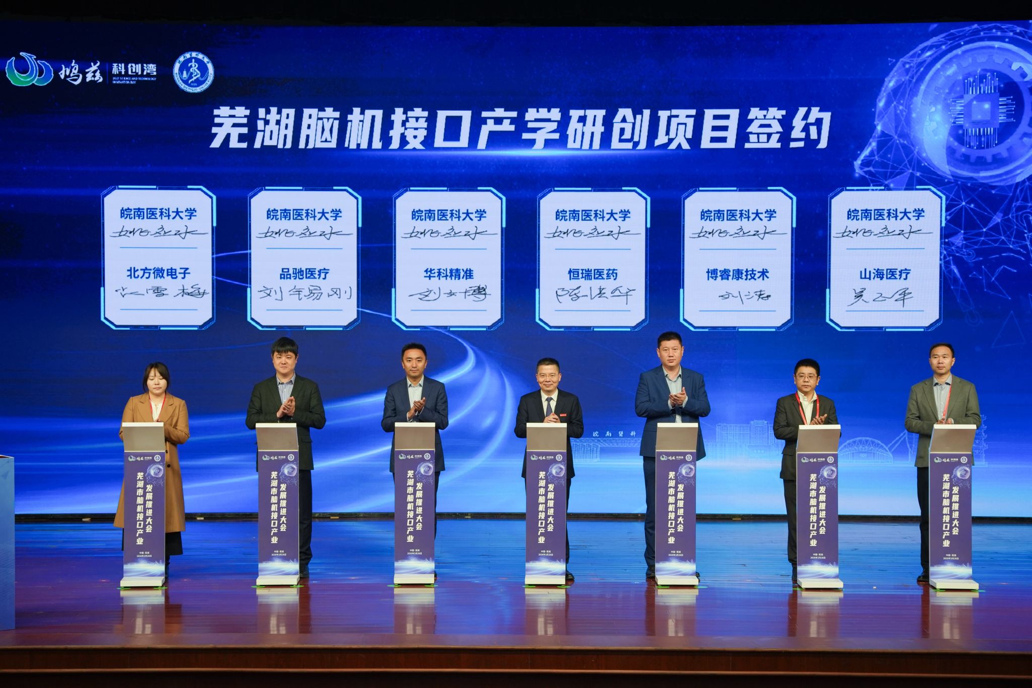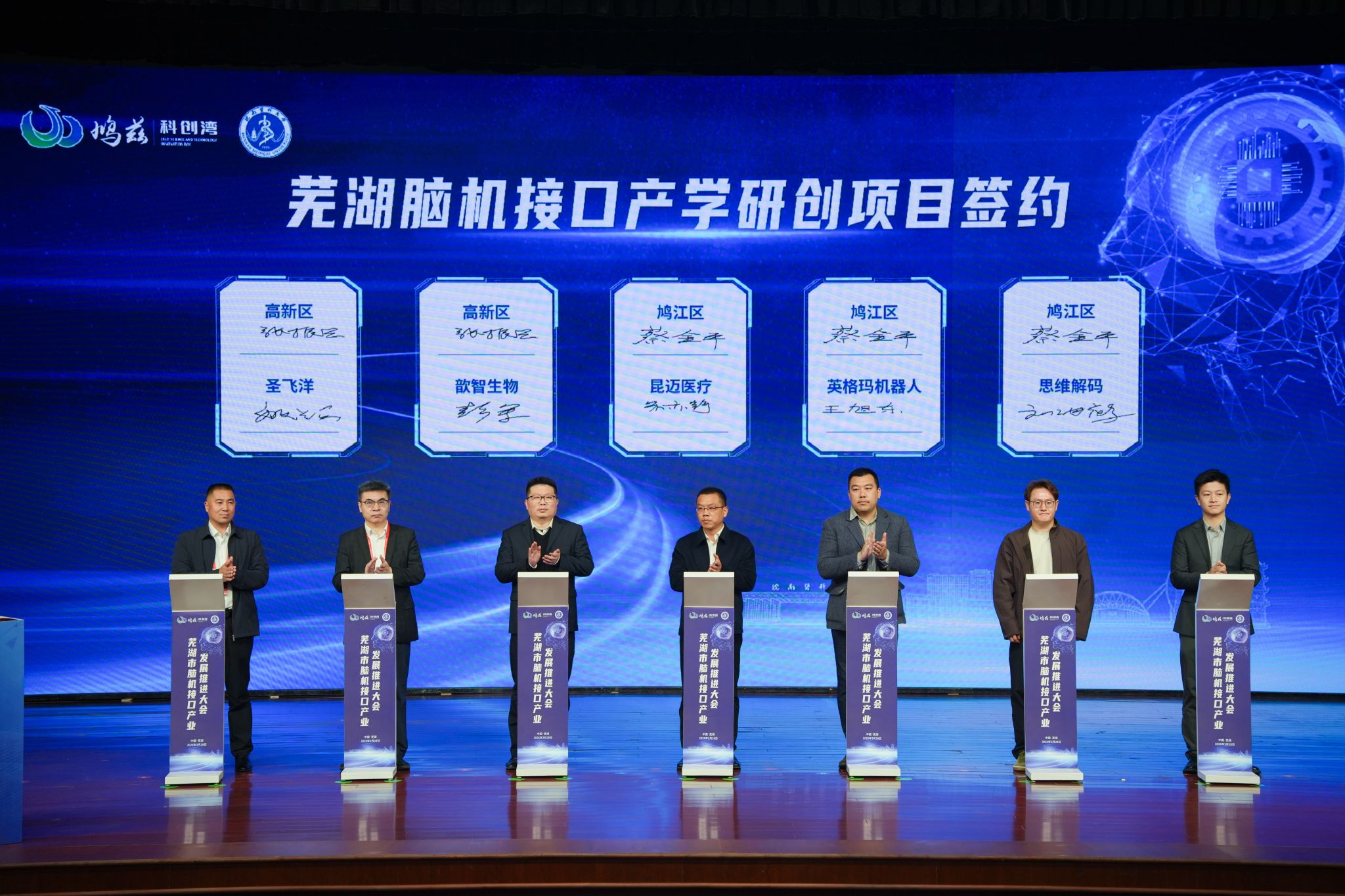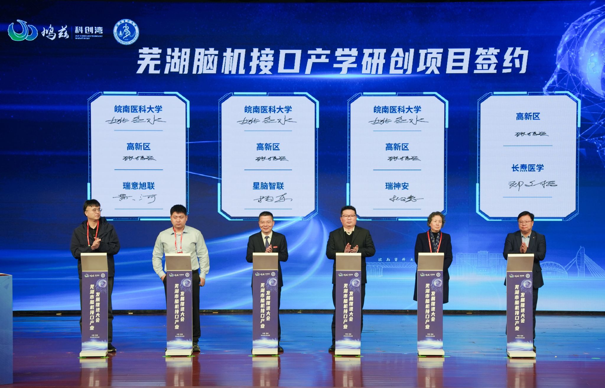 活动现场,芜湖脑机接口产业发展战略咨询委员会名单发布,并向主任委员、副主任委员颁发聘任证书;芜湖市脑机接口产业政策、脑机接口临床验证中心建设方案正式发布;15个芜湖脑机接口产业项目现场签约。(何丽/文 吴小婉、李晓晓、郭佳薇/摄)