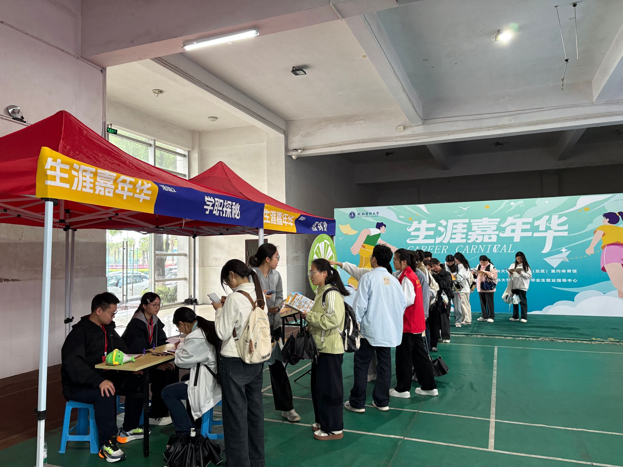 现场气氛热烈有序,省卫生健康委科教处相关负责人围绕住培制度的政策背景、培训环节、待遇保障、职业发展路径等内容进行系统解读。来自安徽医科大学第一附属医院、蚌埠医科大学第一附属医院、皖南医科大学第一附属医院(弋矶山医院)等国家级住培基地现场设点咨询,耐心解答学生关于培训年限、轮转安排、执业医师考试及结业后去向等热点问题。宣讲会现场累计发放政策宣传手册1500余份,近千名学生参与互动交流。同时,学校同步举办了“筑梦青春 职通未来”生涯嘉年华活动,活动将职业生涯规划理论与实践相结合,通过体验式的互动生涯游戏,帮助学生探索生涯、规划职业,引导学生在体验活动乐趣的同时,理性规划个人未来发展,不断丰富职业认知,提升生涯发展能力。