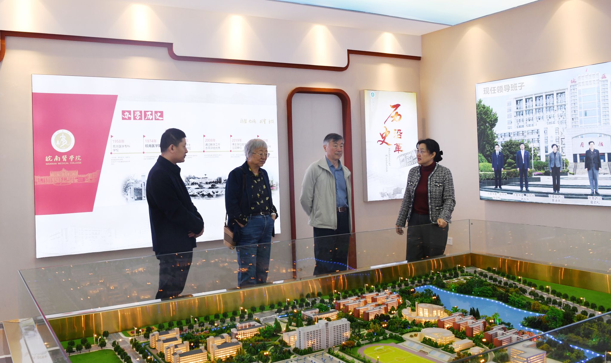 袁钧瑛院士、俞强教授一行先后走进校史馆、逸夫科技楼、赭麓校区和校友之家等地,实地了解学校办学历史、学科建设、科研平台、人才培养及校园文化建设情况。在校史馆,院士、教授认真聆听学校六十余年发展历程,对学校扎根皖南、精医尚德、服务区域医疗卫生事业发展所取得的成就给予高度评价。在逸夫科技楼,详细了解中心实验室、大型仪器共享平台与科研创新平台建设运行情况,对学校强化科研支撑、推进基础与临床融合的发展思路表示认可。漫步赭麓老校区与校友之家,深切感受学校深厚的人文底蕴与浓厚的母校情怀,对学校传承皖医精神、凝聚校友力量、赋能高质量发展的举措深表赞同。