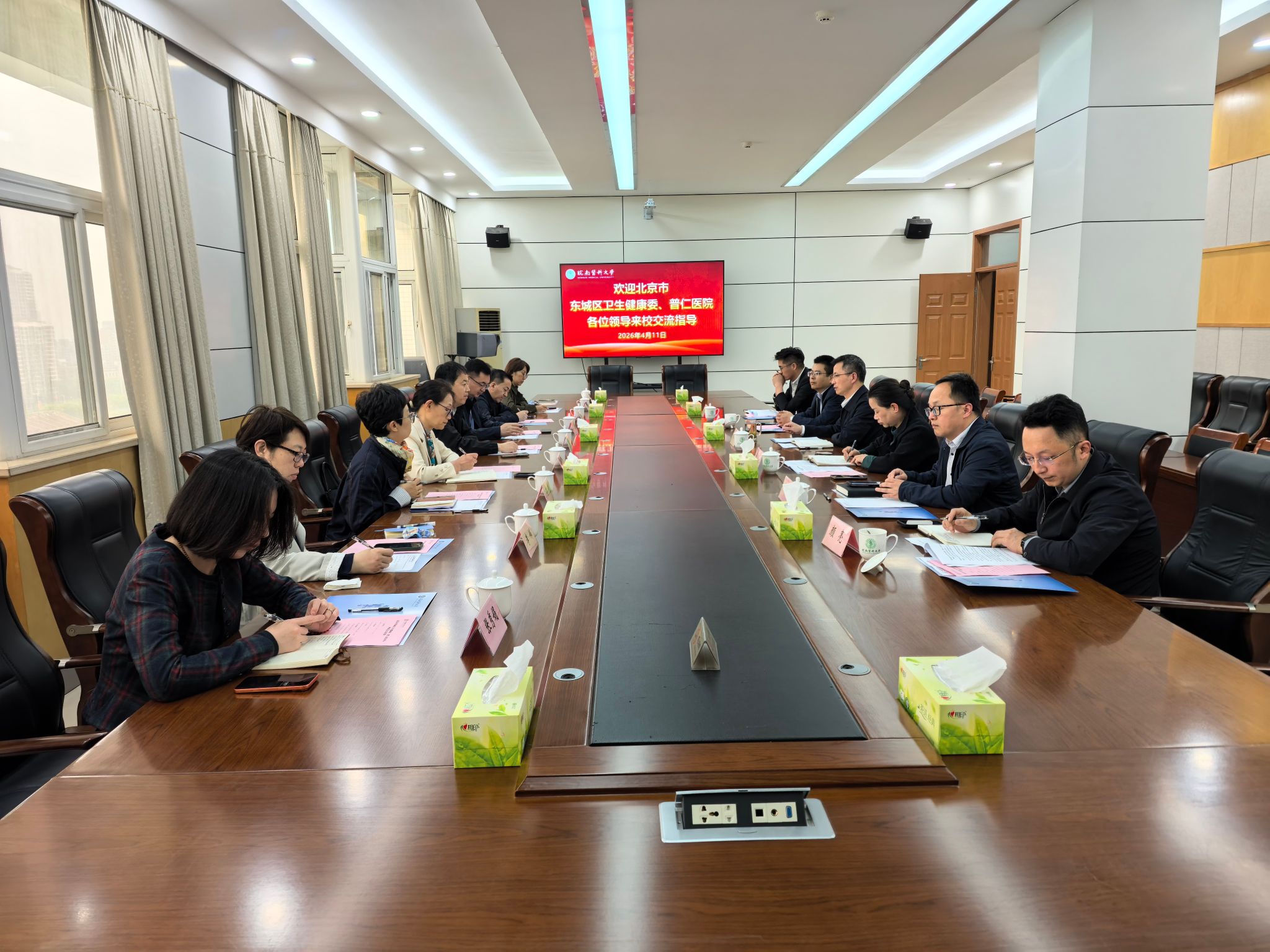 4月11日,北京市东城区卫生健康委副主任秦志轶、北京市普仁医院院长谷强一行来校座谈交流。校党委常委、副校长余结根主持会议。