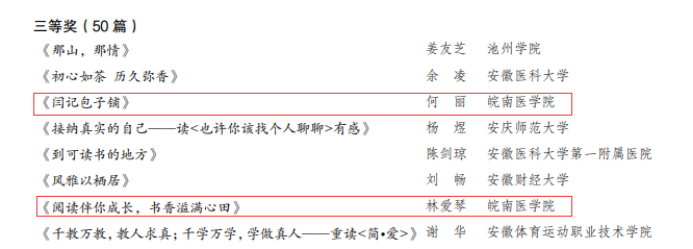 此次活动我校共选送5篇优秀征文作品参加评选,经专家组评审,马克思主义学院黄英老师的《灯暖——读< 我的二本学生>有感》获一等奖,宣传部何丽老师的《闫记包子铺》、基础医学院林爱琴老师的《阅读伴你成长,书香溢满心田》以及图书馆姚垚老师的《逐梦巾帼心向党 牢记使命勇担当》获三等奖。