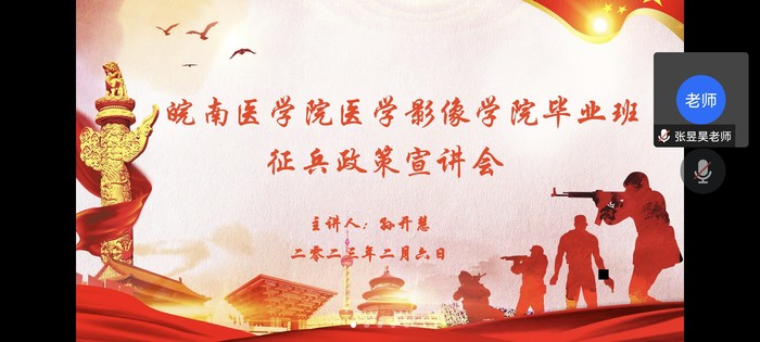 为扎实做好毕业生征兵工作,扩宽毕业生就业渠道,医学影像学院于2月6日晚利用腾讯会议线上召开2023届毕业生征兵宣讲会。本次活动由毕业班辅导员主持,邀请学生处原国防教育科科长孙开慧宣讲,学院2018级医学影像学和2019级生物医学工程、医学影像技术三个专业近300名毕业生参加会议。