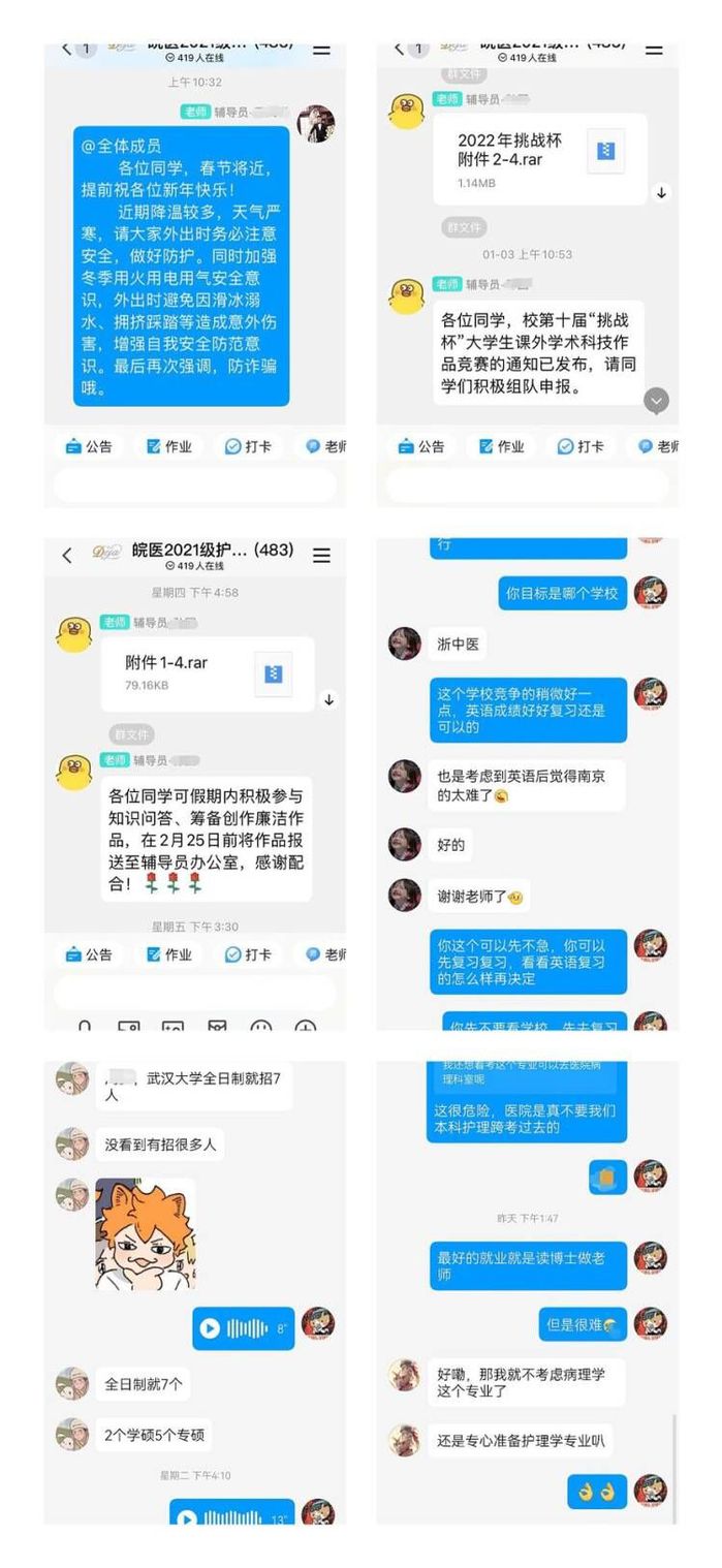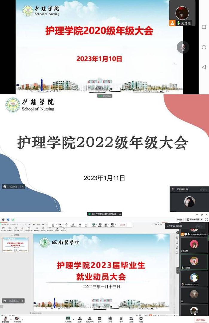 1月3日、10日、11日和13日,护理学院四个本科年级分别通过线上方式召开年级大会,会议由各年级主任主持。年级大会上,各年级辅导员对学期各项工作进行了总结,对假期学生安全教育进行了强调,一是注意个人防护,加强身体锻炼,做自身健康的第一责任人;二是注意人身财产安全,重点开展了防火防电、防溺水、防交通事故、防诈骗、防传销、防邪教等安全教育宣传;三是合理规划作息时间,就近就便开展社会实践,做好下学期开学考试准备等。