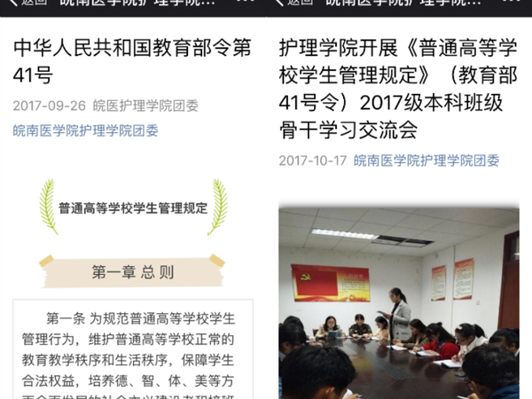 三、强化宣传意识,营造浓厚学习氛围。为进一步加强对《< 普通高校学生管理规定>(教育部41号令)皖南医学院实施办法》等规定的宣传,我院充分利用微博、微信公众号、校园网、QQ群等,充分做到线上线下学习相结合,个人自学和集体学习相结合,使学生全面了解、掌握相关具体内容。