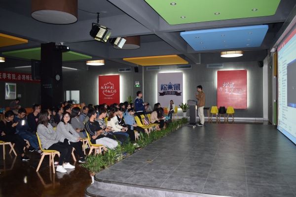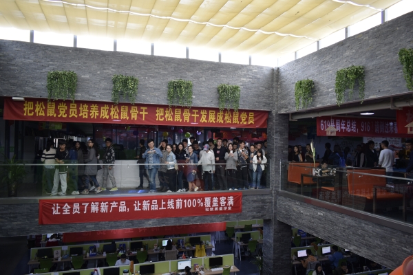 师生们在“松鼠洗脑院”了解三只松鼠创办历程