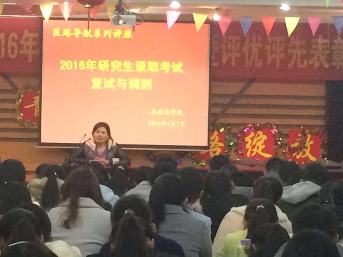 2016年硕士研究生录取工作即将拉开帷幕,为指导临床医学院2011级考研学子积极应对考研复试、调剂及后续工作,2016年3月5日晚,临床医学院特邀我校研究生学院院长郑兰荣在赭麓校区4号楼七楼报告厅为同学们做了一场别开生面的“硕士研究生复试及调剂讲座”,300多位同学到场聆听。