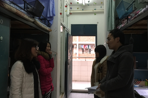 检查组一行首先来到1号实验楼3楼,对教师办公室、实验室等可能存在的安全隐患进行逐一排查,同时提醒各位老师做好学期结束及寒假期间有关安全用电、用水、防盗等工作;来到3号实验楼6楼,对专业实验室进行了重点检查,要求试剂的保管与存储、仪器的安全与维护责任到人,做到“谁管理、谁负责、谁尽责”。学生宿舍检查采取学院抽查和辅导员全面检查相结合,对脏乱差的宿舍当场进行批评教育和及时整改,提醒同学们在做好考试月复习迎考的同时也不能忽视宿舍安全卫生,为复习备考提供一个舒心环境。