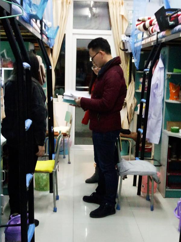 走访学生宿舍,关注特情学生近期,学院党政领导带领辅导员老师深入学生宿舍进行安全隐患排查和看望紧张备考的学生,对宿舍安全状况进行检查,提醒同学们在备考过程中放好心态,注意合理运用时间,保证充足营养,积极营造一个安全和谐的生活、学习环境。