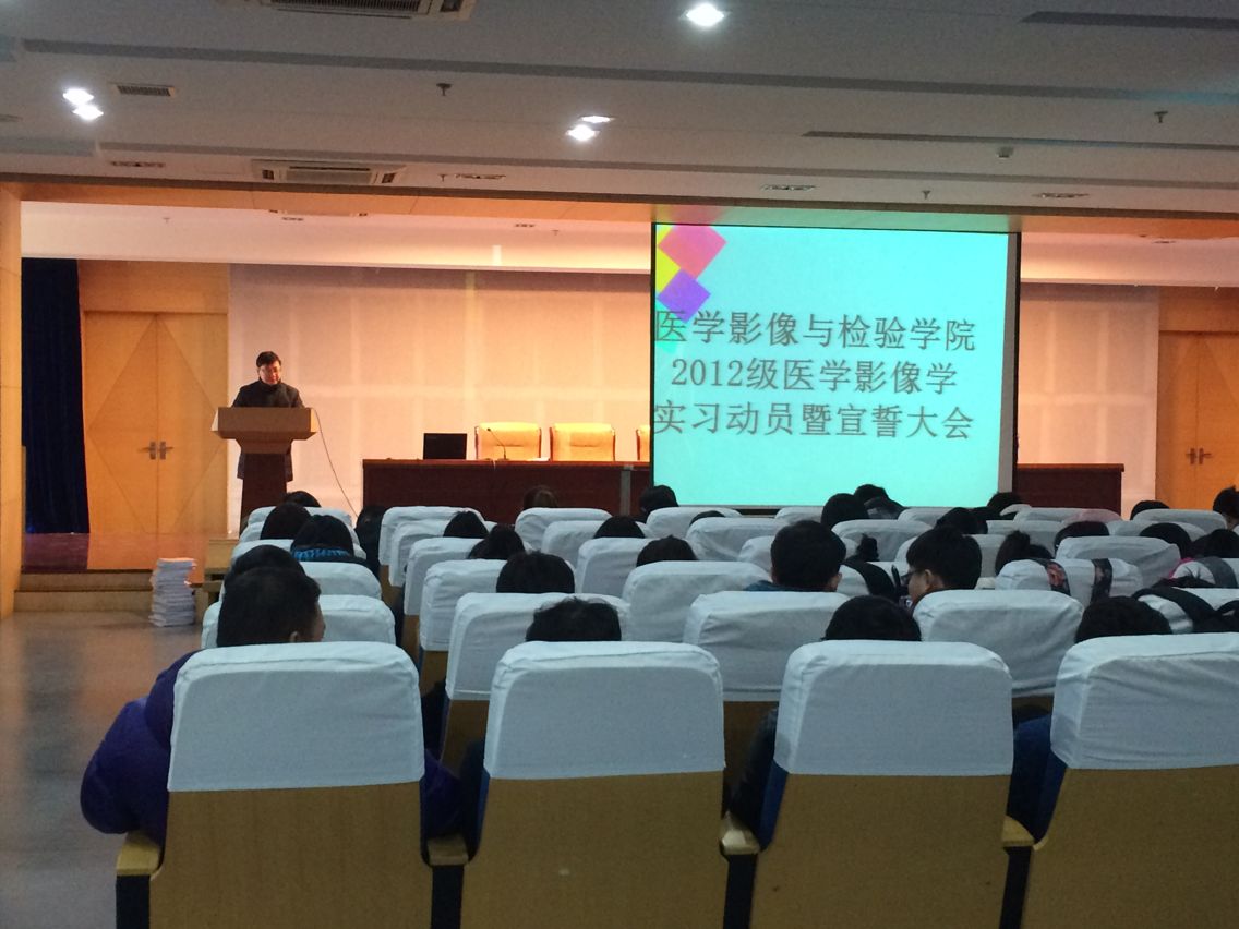 为了深入和扎实推进学院实习工作,提高毕业实习质量,12月15日下午,医学影像与检验学院在图书馆三楼报告厅召开了2012级医学影像学专业实习动员暨宣誓大会,学院副院长许国飞和相关实习带队老师出席了动员会,会议由2012级辅导员陶香林主持。
