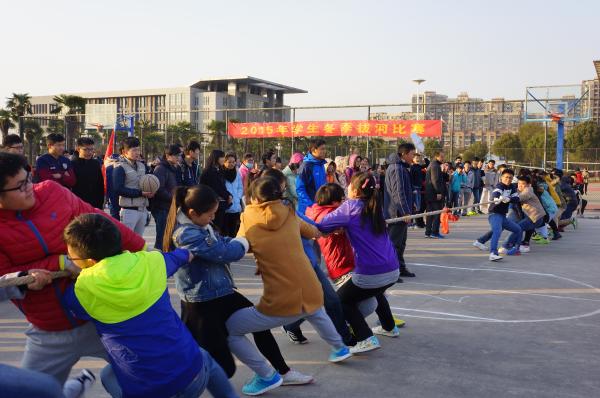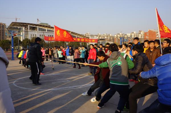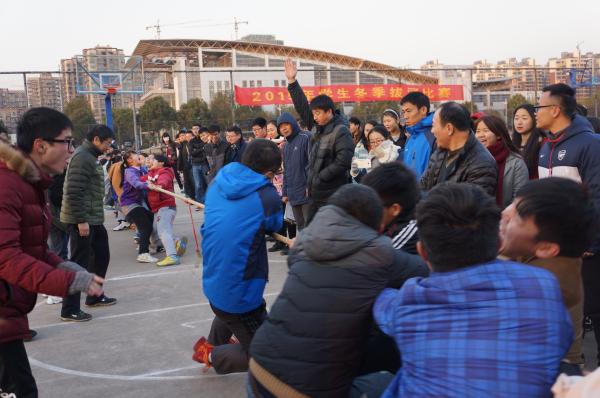 为丰富我校大学生的课余文化生活,强健体魄,增强院系凝聚力,我校2015年学生冬季拔河比赛于12月13日下午四点在篮球场举行。全校共有十支参赛队伍,每队15人,男队员10名、女队员5名。比赛采用单淘汰赛制,每场比赛三局两胜。此次拔河比赛是校园群体活动之一,今年首次举办受到了各学院的一致好评。