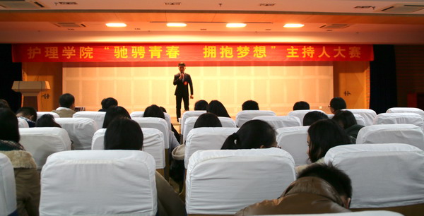 为丰富校园文化生活,给热爱主持的同学提供锻炼机会和展示平台,护理学院于11月24日晚在图书馆三楼学术报告厅开展了“驰骋青春,拥抱梦想”主持人大赛。护理学院辅导员王结义、黄静、赵兰兰、姚垚、汪峰等5位老师出席了本次比赛并担任了本次比赛评委。在主持人深情并茂的介绍下,比赛拉开了序幕。决赛分为三个环节:自我介绍,才艺展示和模拟主持。12位参赛选手各个多才多艺,将自己最出色的一面展现在评委观众面前。动听的歌声,幽默的段子,优美的拉丁,给我们带来一次视觉和听觉上的享受;各种有代表性的模拟主持,如晚会主持、新闻报道、娱乐报道等,体现得活灵活现,全场气氛持续高涨。比赛结束后,主持人宣布了获奖名单,几位评委颁发奖品并合影留念,本次比赛在愉快的气氛中落幕。