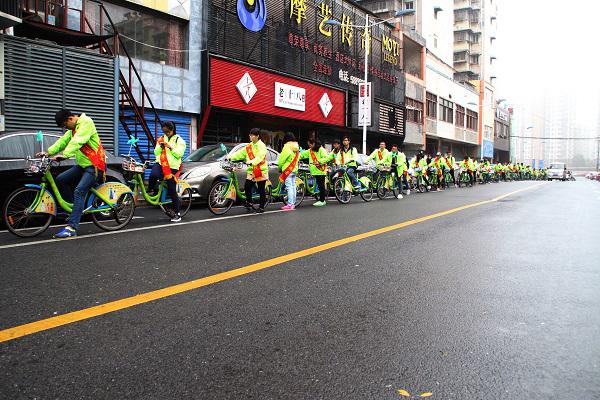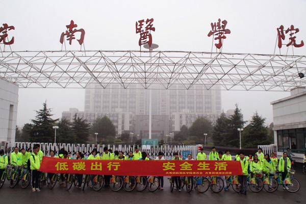 2015年11月22日,细雨霏霏、薄雾绕城的芜湖大街上,穿流着一条鲜绿色的“彩带”,那是皖南医学院环保协会的青年志愿者身着绿色志愿者服,脚踩绿色公共自行车,化身“绿色安全使者”为美丽江城又添一道风景线。该活动是由共青团皖南医学院委员会与芜湖镜湖区团委、镜湖区市容局联合举办的“低碳出行 安全生活”主题骑行活动。我校团委书记李娜、副书记余亮、秘书饶婷婷,团镜湖区委副书记牛屹、镜湖区教育局副局长、团区委副书记张犟,镜湖区市容局队员参与本次活动。