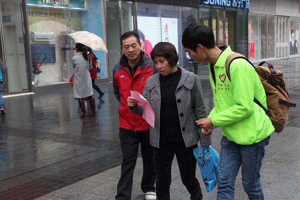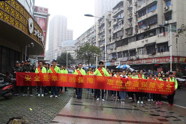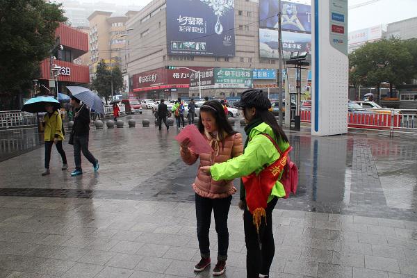 到达目的地后,志愿者分成三个小分队分别在新百大厦、苏宁广场、华亿广场开展活动,并与镜湖区城管局的执法人员一起,深入公安街、阳光支巷等背街巷,向经营户和广大市民发放《参与城市管理维护城市环境》倡议书,号召大家自觉抵制占道经营,携手共创文明和谐城区。调研公众日常的出行方式,了解公众对新安街小吃摊看法,积极鼓励大家低碳出行,倡导群众自行监督,抵制占道经营,保障安全幸福生活。