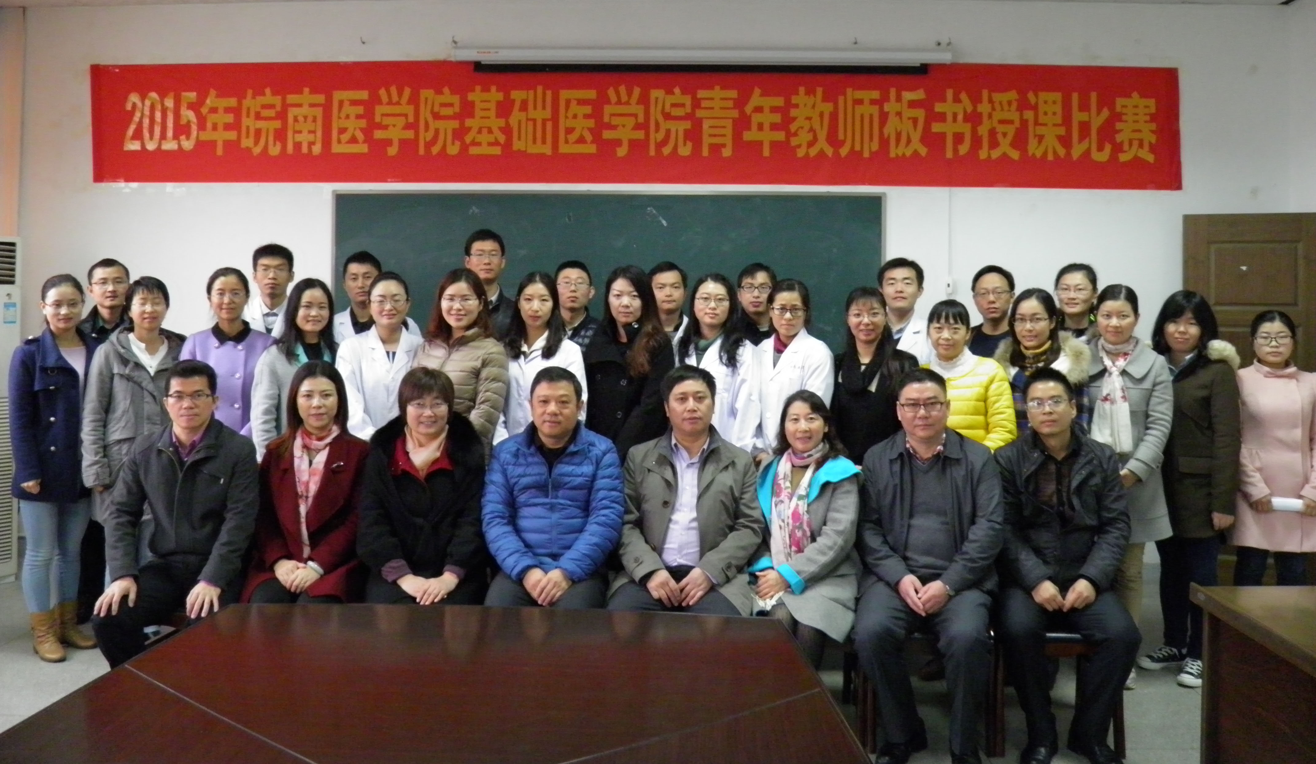 为提高我院青年教师板书授课水平,选拔参加学校青年教师板书授课比赛人选,根据校《关于举办2015年皖南医学院青年教师板书授课比赛的通知》文件精神,学院于11月22日在滨江校区基础医学院会议室举行了2015年青年教师板书授课比赛。此次比赛邀请5位学校教学督导组专家作为评委,我院部分教师现场观摩,基础医学院党总支书记韩军、院长李铁臣、副院长陈祥攀全程参与了比赛活动,比赛由李铁臣主持。