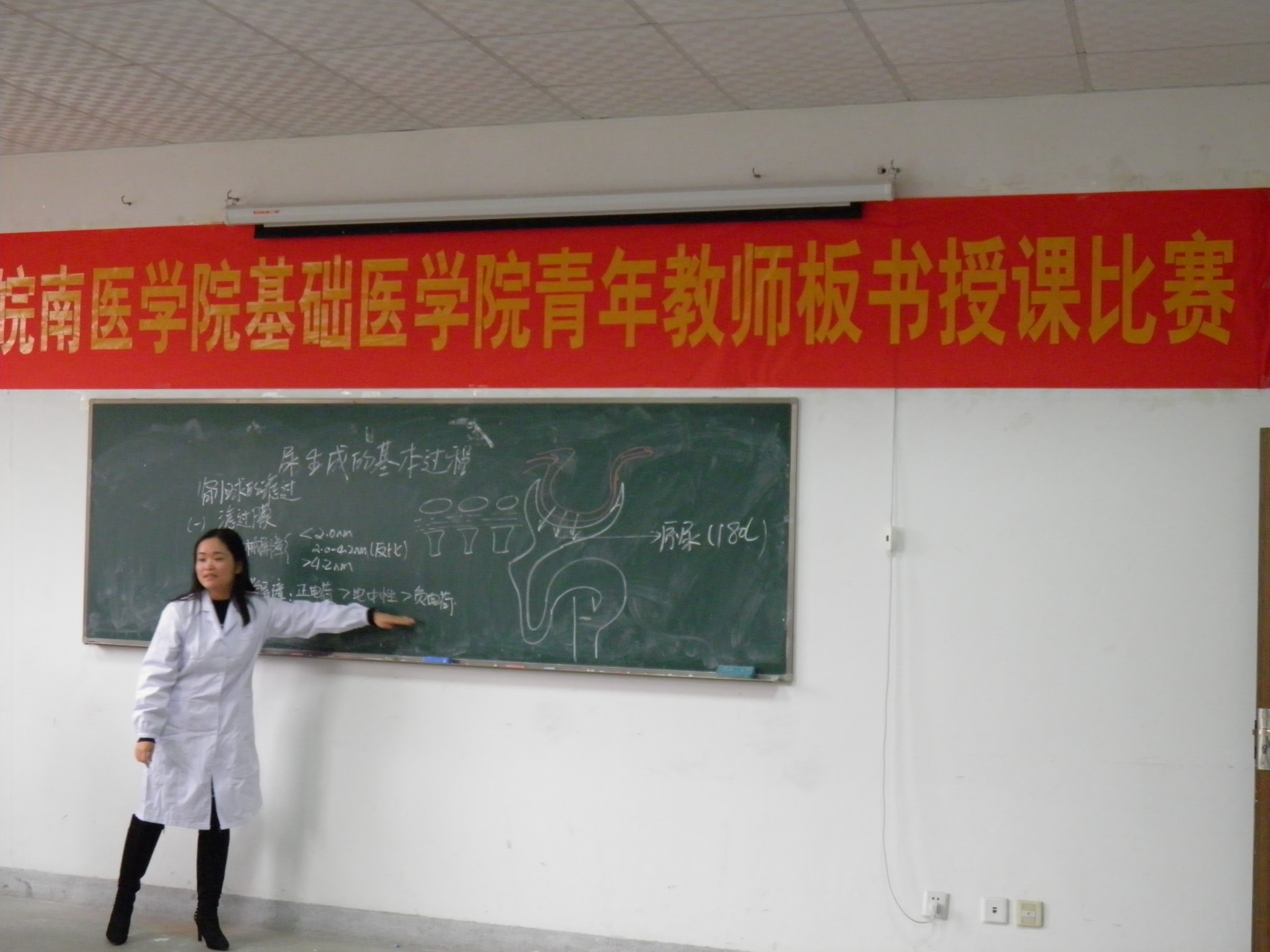 我院符合条件的29名青年教师全部参加了比赛。他们结合所授课程的特点,通过文字、公式、图表等直观素材,从教案设计、板书书写、课堂讲解、现场互动等方面进行充分的展示。整个比赛过程中,青年教师们板书布局合理、条理清楚、书写规范,重难点突出,现场气氛热烈。经过激烈角逐,李敏、王薇、王静、刘敏、丁见5位老师获得一等奖,张雨微等10位老师获得二等奖,程桂平等14位老师获得三等奖。赛后,各位专家评委依次对参赛教师讲课作了精彩点评,对青年教师的教学水平给予了充分肯定,同时也指出了进一步完善的建议,就板书的布局、教具的准备、课程的导入、与临床方面相结合等方面提出了宝贵意见。