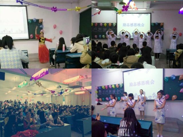 11月20日晚,2015级护理专科在1203教室举办了励志感恩晚会,晚会在民族舞《天竺少女》中拉开了帷幕。歌舞、小品、朗诵、脱口秀、乐器独奏为大家带来了一场视觉盛宴。自编、自演的小品《都是QQ惹得祸》令人捧腹大笑;笛子的悠扬音符向观众传播着爱的福音;古典舞《青花瓷》展示着东方的神韵;手语舞蹈《感恩的心》表达全体学生对祖国、学校和父母深切的感恩和祝福。诗朗诵包含着同学铿锵自信和对未来的无限希望,为本场晚会划上了圆满的句号。整场晚会精彩不断,高潮迭起,赢得台下阵阵掌声。